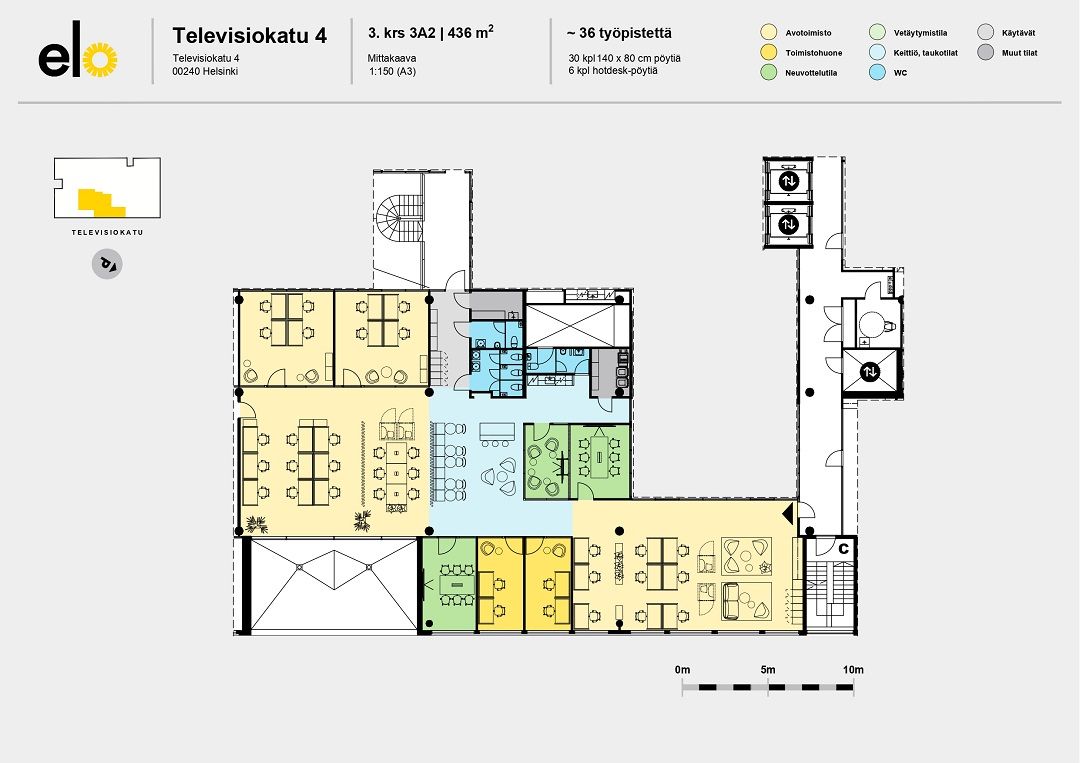 Neljännen kerroksen 436m2 toimistotila, jossa avotilaa, sekä 2 neuvottelutilaa (4 ja 14-16 hengelle)