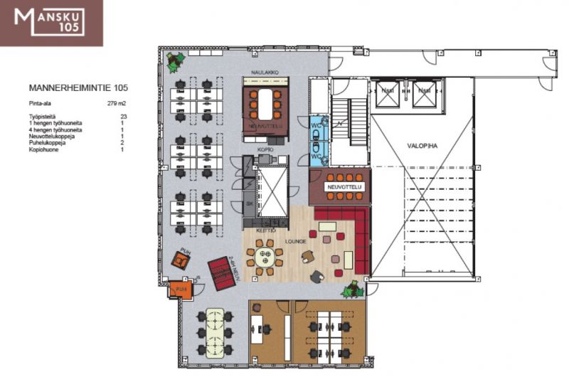 Hgin Mannerheimintie 105 on moderni toimistokiinteistö näkyvällä ja helposti saavutettavalla paikalla Manskun loppupäässä ruskeasuolla.