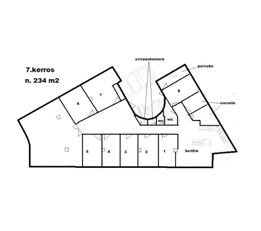 Tämä 234m2 tila kattaa kiinteistön 7. kerroksen. Tila kostuu kahdeksasta työhuoneesta, avotilasta, kahdesta varastosta sekä omista keittiö ja wc-tiloista. Tilaan kuuluu myös oma parveke.