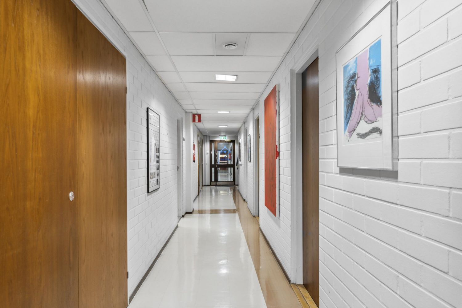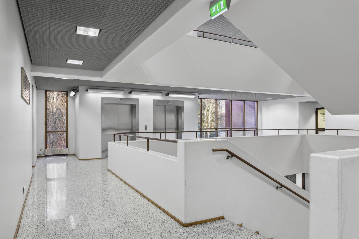 Pääsisäänkäynti näyttävän aulatilan kautta, jossa myös hissit.