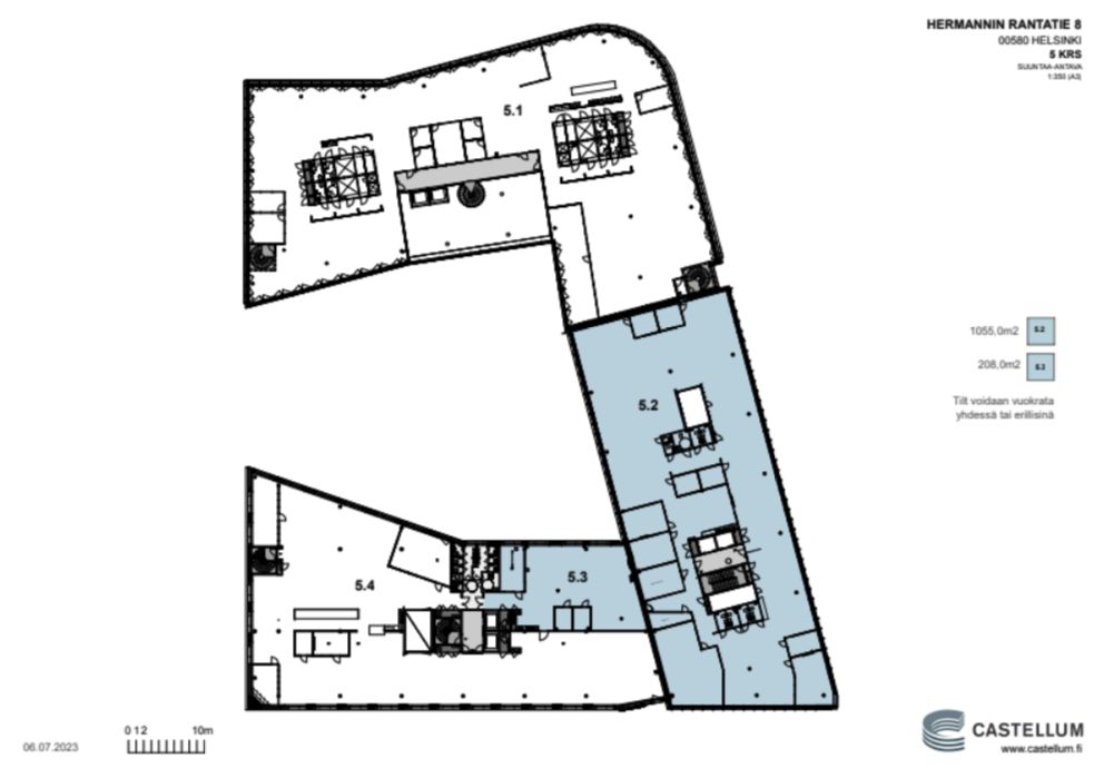 Tämä 1055 m² moderni monitilatoimisto sijaitsee kiinteistön 5. kerroksessa. Tila on valoisa avotoimistotila huoneilla. Avotila on jaettu osittain omiksi työalueiksi isommille ja pienemmille tiimeille, lisäksi neuvottelu- ja teamstiloja. Tilassa on suuri keittiö, loungealue ja omat wc:t. Tila on mahdollista yhdistää viereisen 208 m² tilan kanssa, jolloin kokonaisneliöt ovat 1263 m². Kuvat ovat yleiskuvia kiinteistön tiloista.