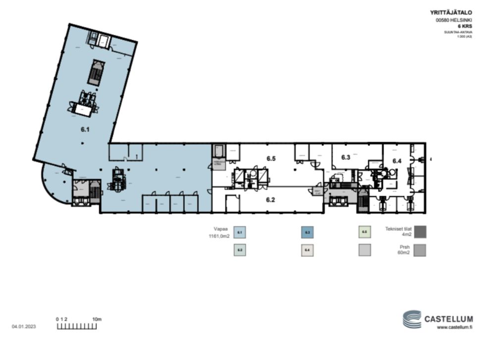 Tämä 1161 m² toimistotila sijaitsee kiinteistön 6.kerroksessa. Ylimmän kerroksen toimitila, johon tulee tavarahissi. Soveltuu toimisto-, showroom- ja varastotilaksi. Paljon avotilaa ja muutamia huoneita. Korkeaa tilaa n. 60 m² alueelta sisääntulon edessä. Tilassa on epoksimaalattu lattia, uusittu valaistus, wc:t ja uudehko keittiö. Tilaa on mahdollista laajentaa n. 224 m², jolloin kokonaisneliöt ovat n. 1385 m². Talon pihassa on lastauslaituri.