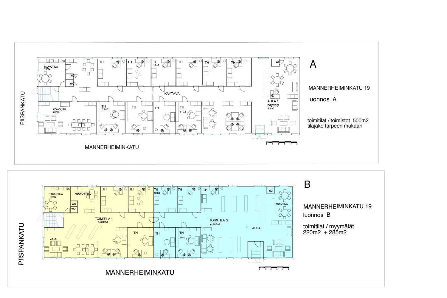 B ja C ehdotuksessa tila on jaettu kahdella eri tavalla toimistoon 220 m² ja myymälätilaan 285 m².