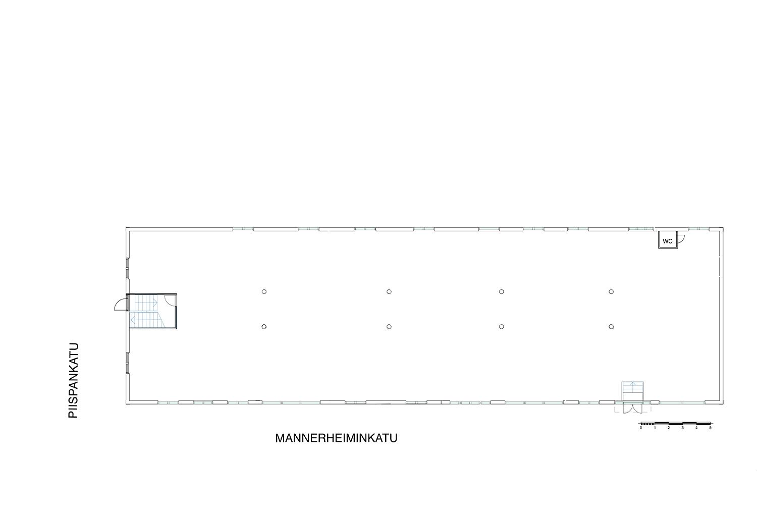 A ehdotuksessa koko tila (500 m²) toimistokäytössä, jossa tila jaettu 10 kpl työ-/toimistohuoneisiin, kokoustilaan ja vastaanottoaulaan.