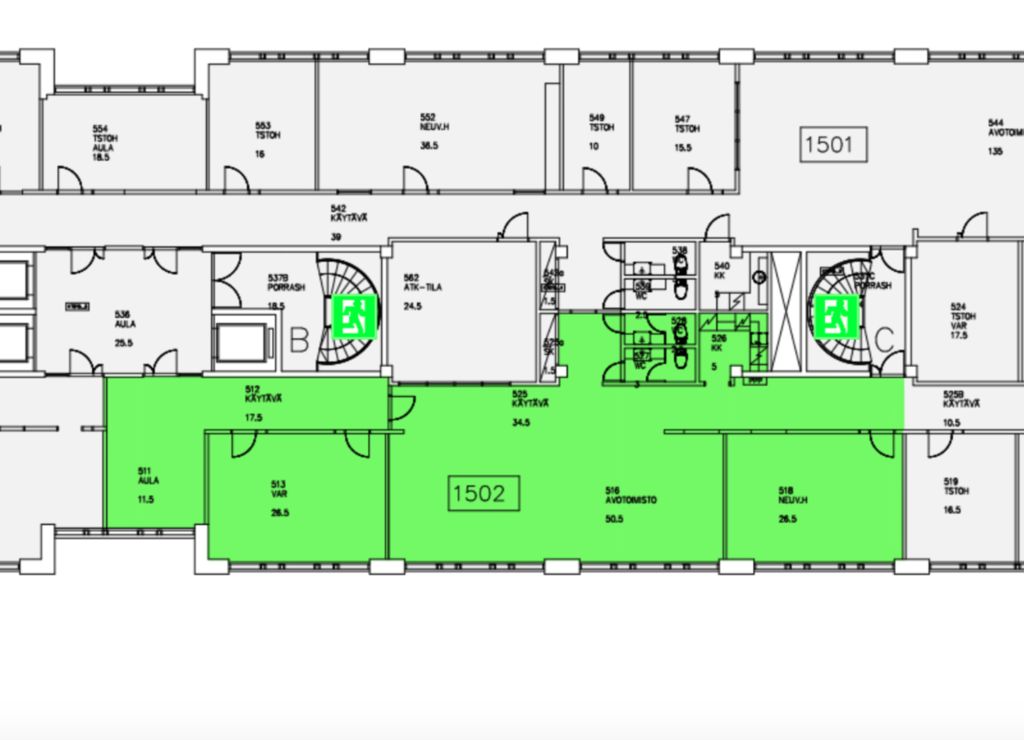 Tämä 184 m² toimistotila sijaitsee rakennuksen 5. kerroksessa. Tilassa on avotilaa, neuvottelutila, varasto sekä omat keittiö ja wc-tilat.