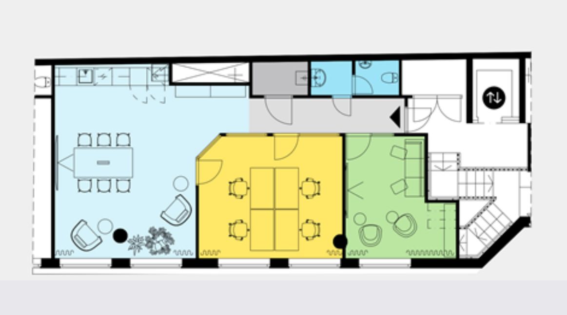 Toimistotila sijaitsee alkuperäistä rakennusta täydentävässä uudemmassa pihasiipirakennuksessa. Sisäpihalta katsottuna tila sijaitsee 2. kerroksessa. Tilaan kuljetaan viihtyisän sisäpihan läpi omasta rapusta. Tilassa uusi avokeittiö, 3 työhuonetta sekä avotilaa, 1 wc sekä siivouskomero. Nykyistä huonejakoa on mahdollista muokata.