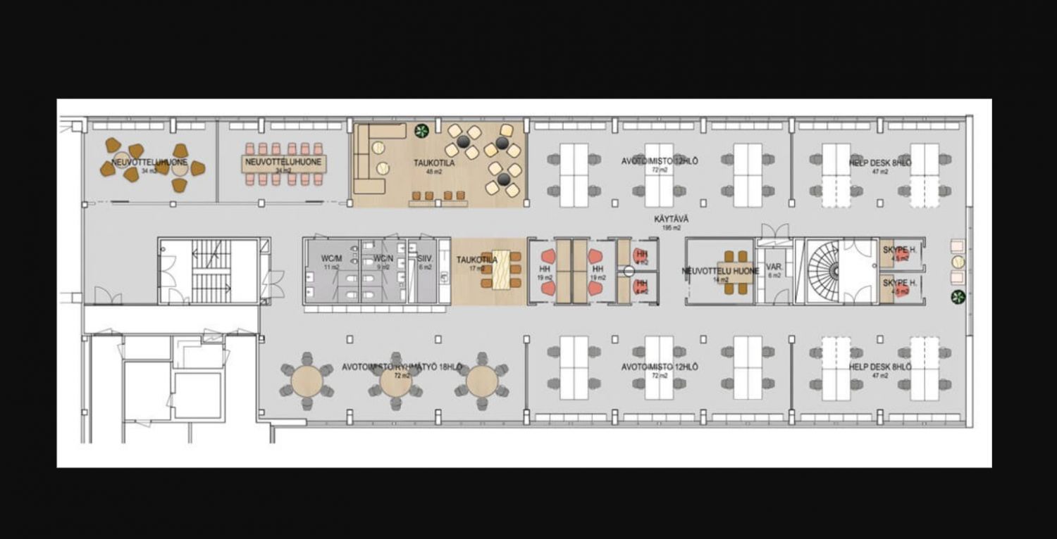 Vuokrattavana 3. kerroksen remontoitua, hienoa toimistotilaa. Toimistossa on on neuvotteluhuoneita, puhelinkoppeja ja upea keittiö.