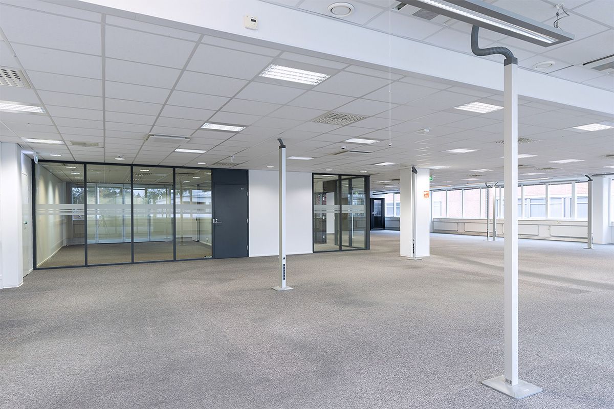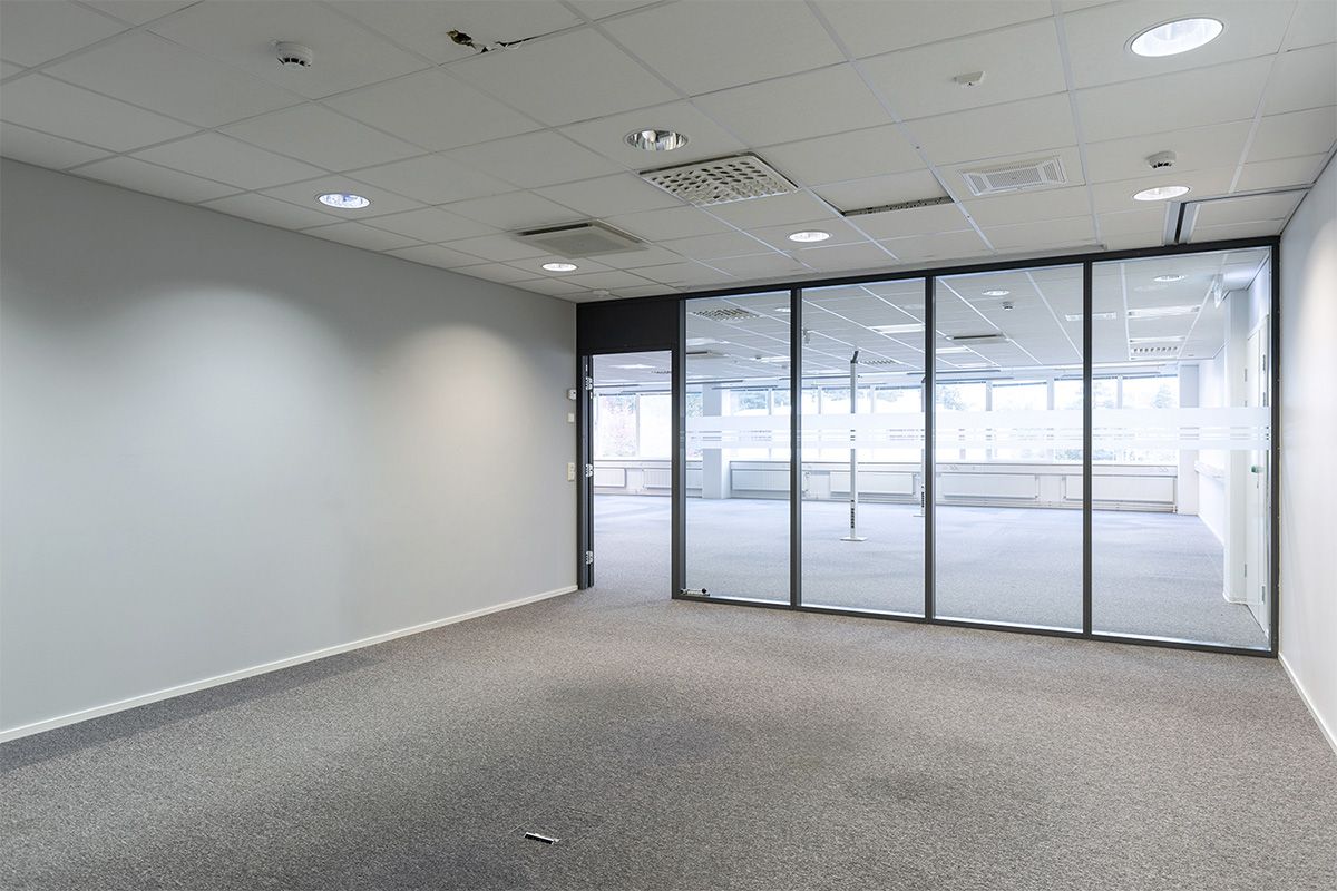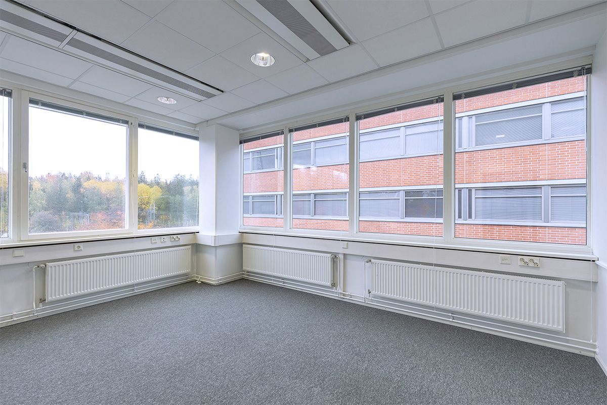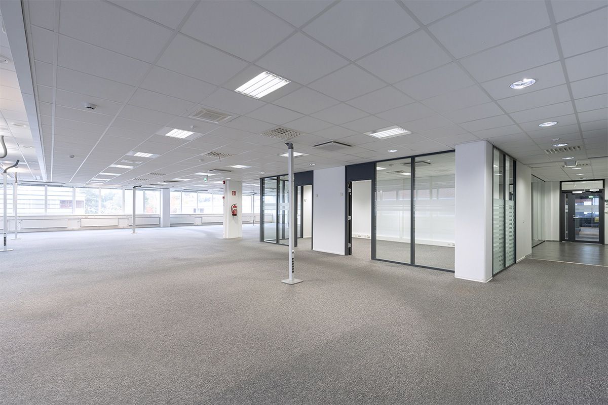 Kolmannen kerroksen valoisa 719 m² toimistotila jossa on suuret ikkunat.