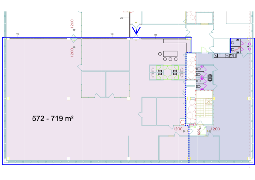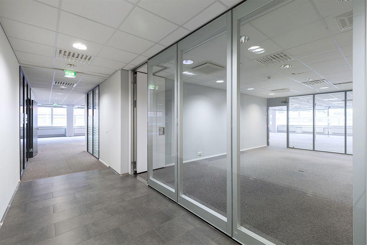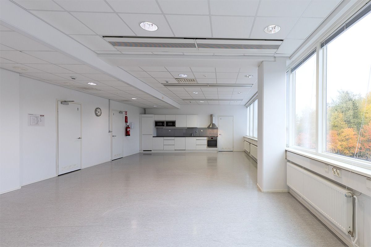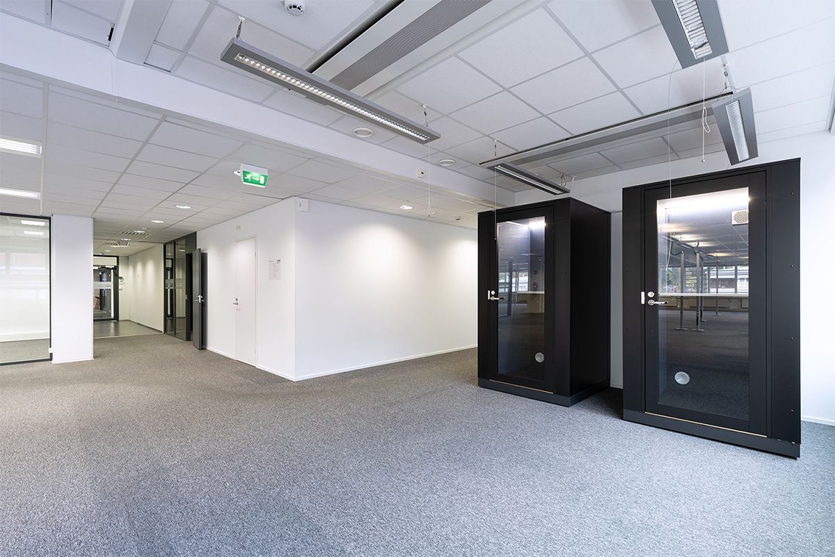Kolmannen kerroksen valoisa 719 m² toimistotila jossa on suuret ikkunat.