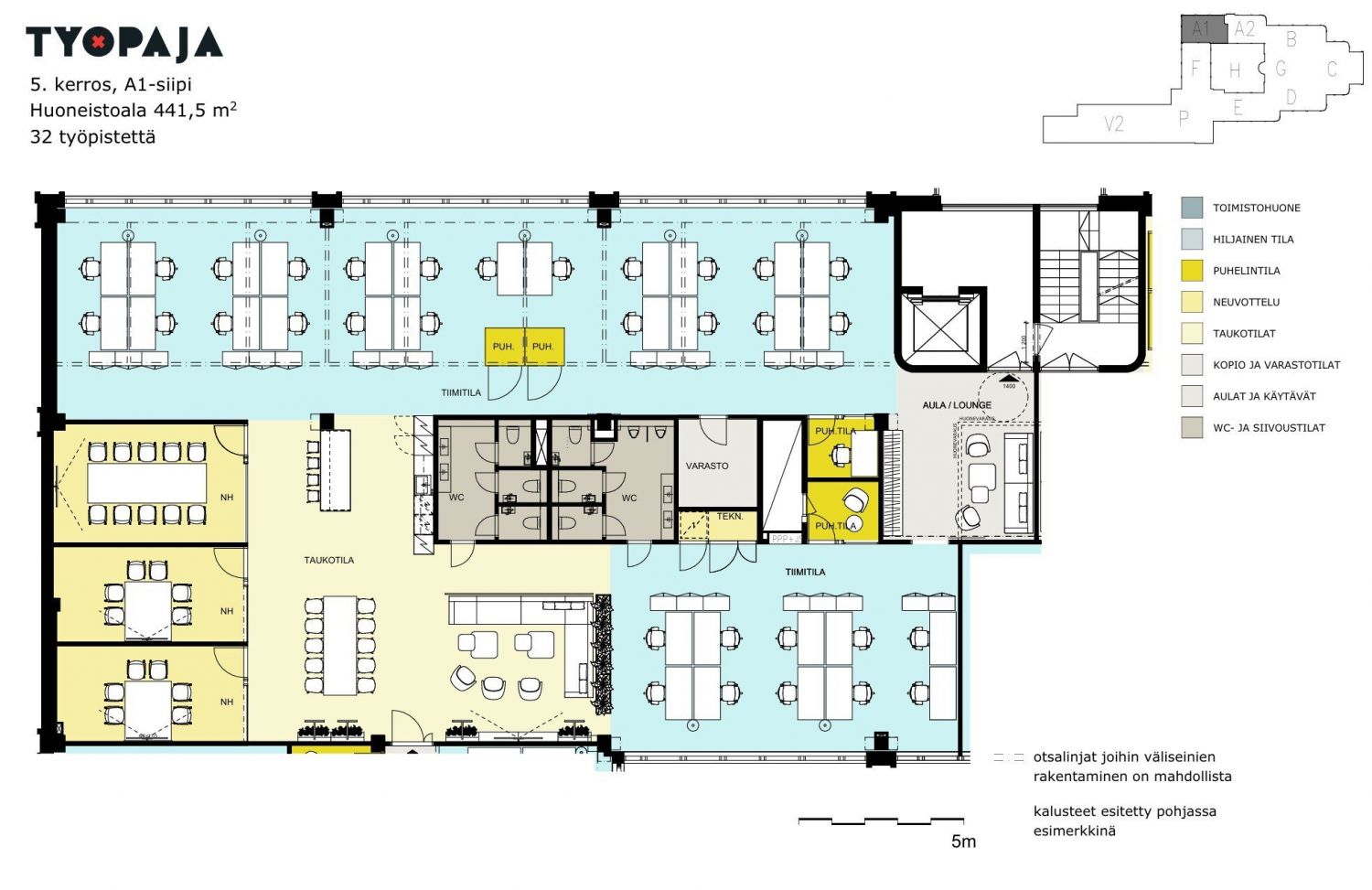 Viidennen kerroksen viihtyisä toimisto Kalasataman Työpajalta. Avotoimiston lisäksi tilaan sisältyy kolme erillistä neukkaria, mukava taukotila-keittiö-lounge-yhdistelmä ja kätevä tiimityötila, erillään muusta avokonttorista. Tilaan kuuluu pari erillistä puhelinkoppia ja -tilaa, sekä luonnollisesti omat wc-tilat.