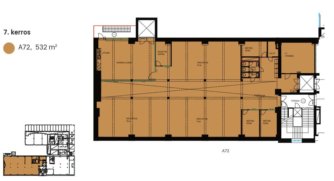 - Elimäenkatu 9 A, tila 72, 7.krs 532,0m². Toimisto vanhalla puolella, kattoikkunat ja korkea huonekorkeus ja parveke