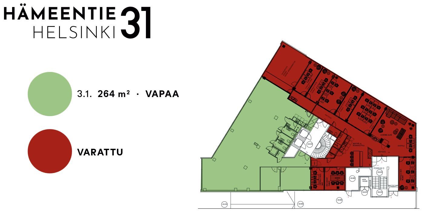 Hämeentie 31:n vuokrattavat tilat sijaitsevat kerroksissa 2–4 ja 6. Kerrosten pinta-alat sijoittuvat välille 545–720 neliömetriä. Yksi kerros on mahdollista jakaa kahteen tai kolmeen osaan, eli tilakoot alkavat noin 200 neliöstä ylöspäin. Tunnelmaltaan valoisien tilojen ikkunat aukeavat jokaiseen ilmansuuntaan ja ne tarjoavat samalla mukavat näkymät läheisiin puistoihin ja kantakaupungin kattojen ylle.