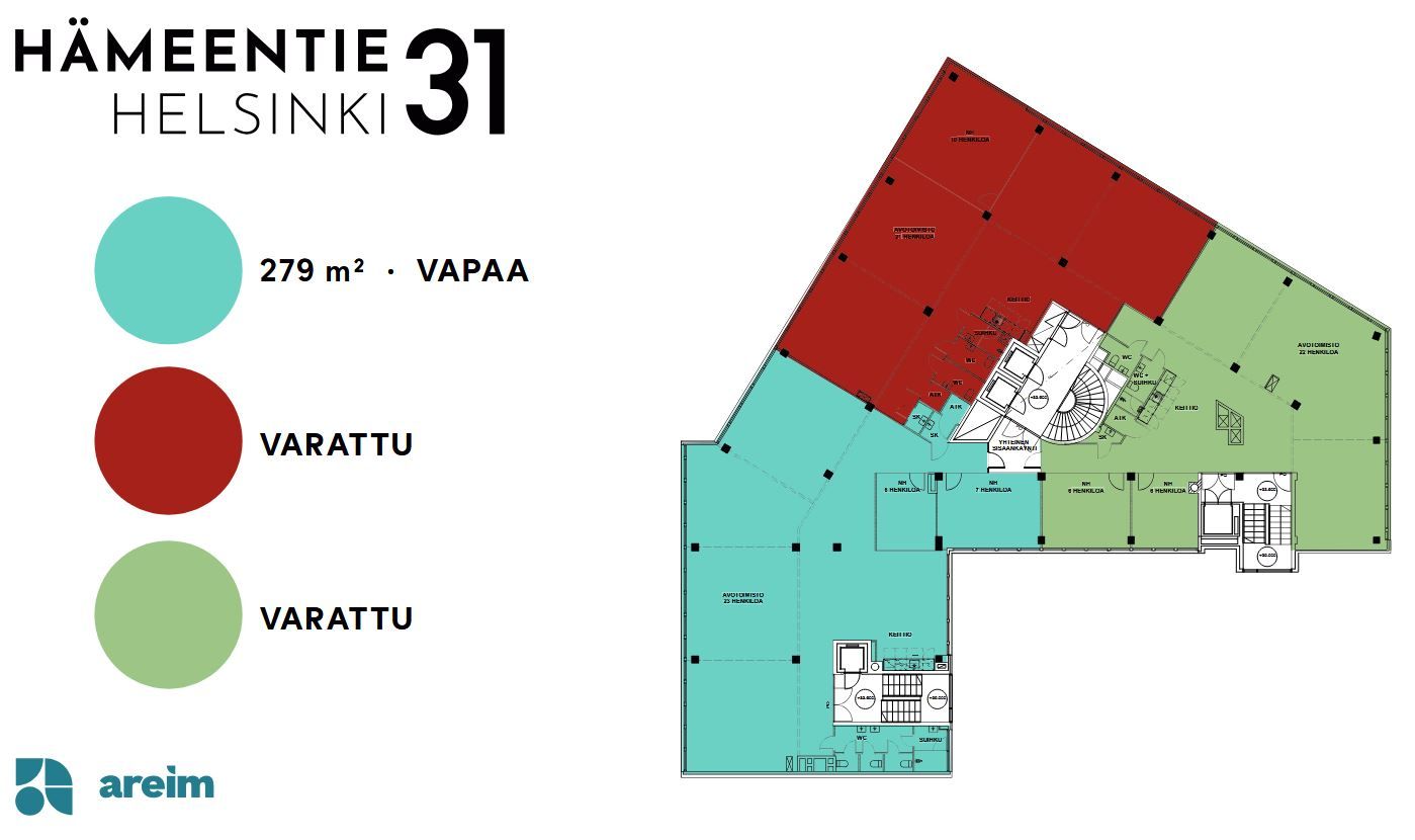Hämeentie 31:n vuokrattavat tilat sijaitsevat kerroksissa 2–4 ja 6. Kerrosten pinta-alat sijoittuvat välille 545–720 neliömetriä. Yksi kerros on mahdollista jakaa kahteen tai kolmeen osaan, eli tilakoot alkavat noin 200 neliöstä ylöspäin. Tunnelmaltaan valoisien tilojen ikkunat aukeavat jokaiseen ilmansuuntaan ja ne tarjoavat samalla mukavat näkymät läheisiin puistoihin ja kantakaupungin kattojen ylle.