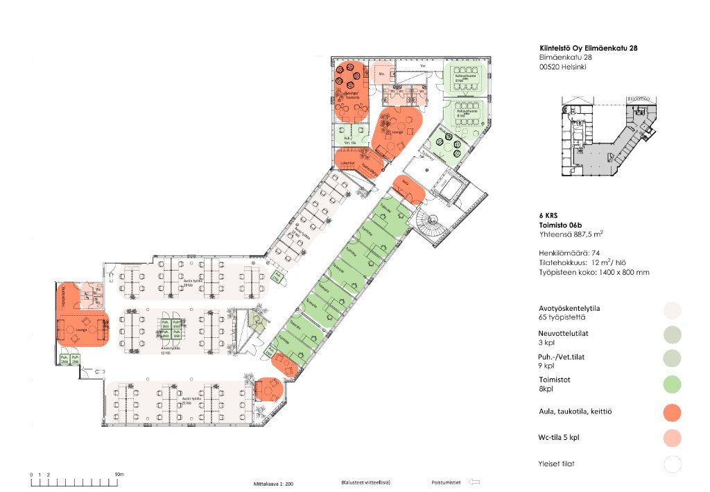 Vuokrattavana 887 m² toimistotilaa Vallilassa, Elimäenkatu 28:ssa, 6. kerroksessa.