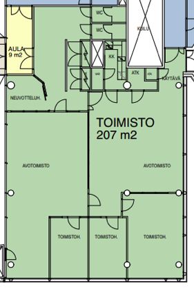 Tämä 207 m² toimisto sijaitsee Nina-talon 3. kerroksessa. Pääosin avotoimistotilaa, minikeittiö ja 2 wc:tä. Ikkunoista näkymät Kaapelitehtaan suuntaan.
