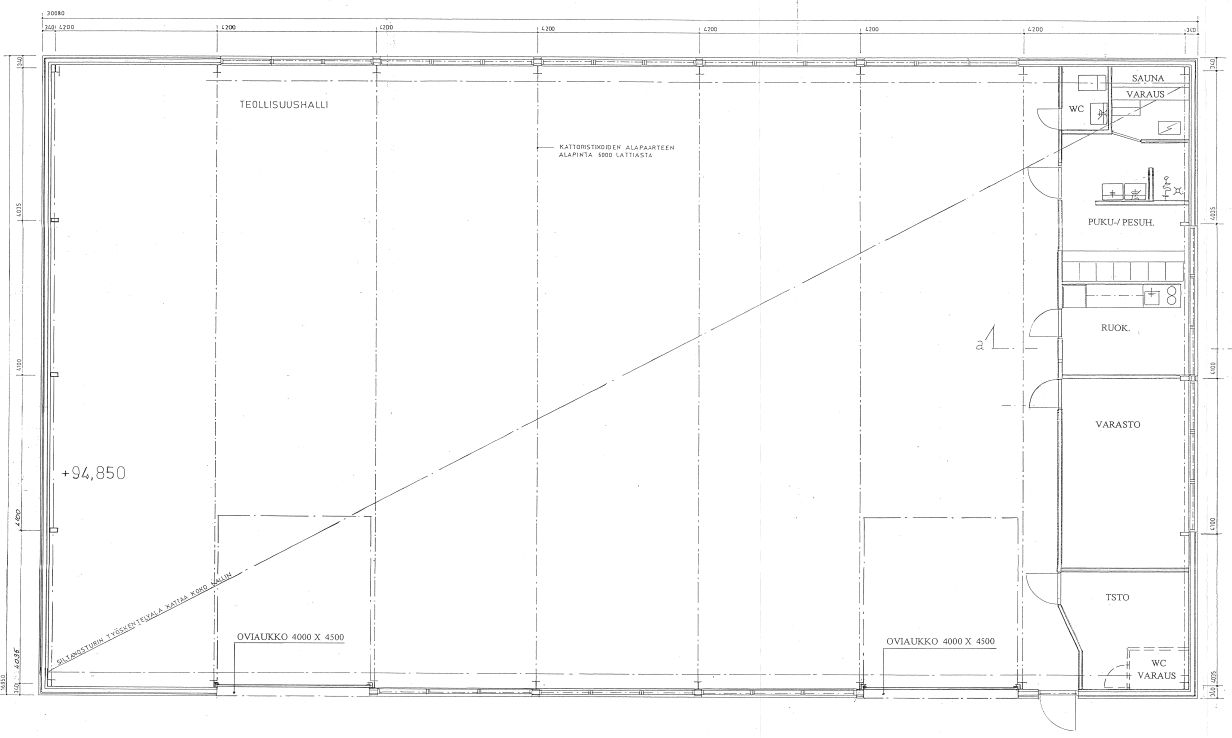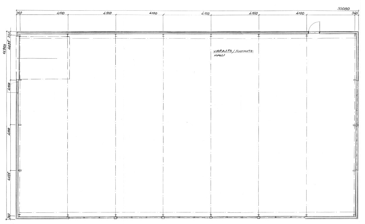 Hallin 1 kerrosala on 1379 m2. Vapaa korkeus 6 m. Kaksi nosto-ovea, koko 4500x5000 mm, toisessa ovessa sähköinen oviverho kuumailmapuhalluksella ja kaukosäätimellä. Neljä käyntiovea. Kaksi siltanosturia, liike koko hallin mitta. Toisessa 5 t ja 3,2 t nostimet ja toisessa 2,4 t nostin.