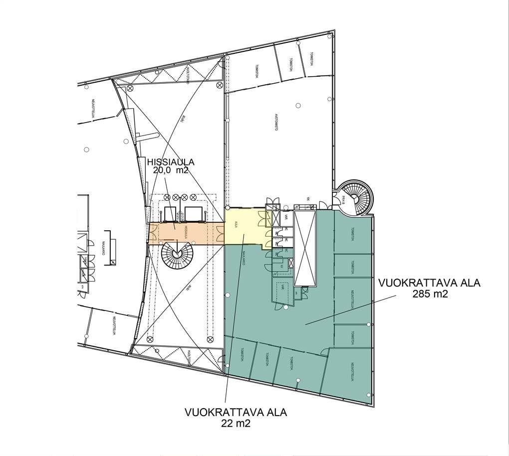 Tämä moderni tila rakennuksen neljännessä kerroksessa antaa omaa rauhaa täällä työskenteleville henkilöile Tilaan kuuluu useita erikokoisia työ- ja neuvotteluhuoneita. Oma keittokomero, wc-tilat ja varasto sujuvoittavat pidemmänkin työpäivän kulkua merkittävästi. Avara tila, jonka reunalla erilliset huoneet sijaitsevat, ei luo ahdasta tunnelmaa vaan pitää toimistotilan ilmeen raikkaana ja viihtyisänä.