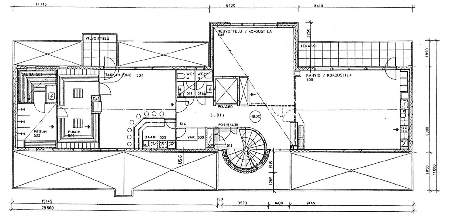 Tilat sijaitsevat hissitalon ylimmässä, 5. kerroksessa. Tilat koostuvat avotoimistotilasta, jossa liikuteltavat väliseinät, kahdesta keittiökalustuksella varustetusta kahvio-/kokoustilasta, joiden yhteydessä parvekkeet. Lisäksi tiloissa on kaksi vessaa ja kylpyhuone-/saunaosasto. Tiloissa koneellinen ilmanvaihto.
