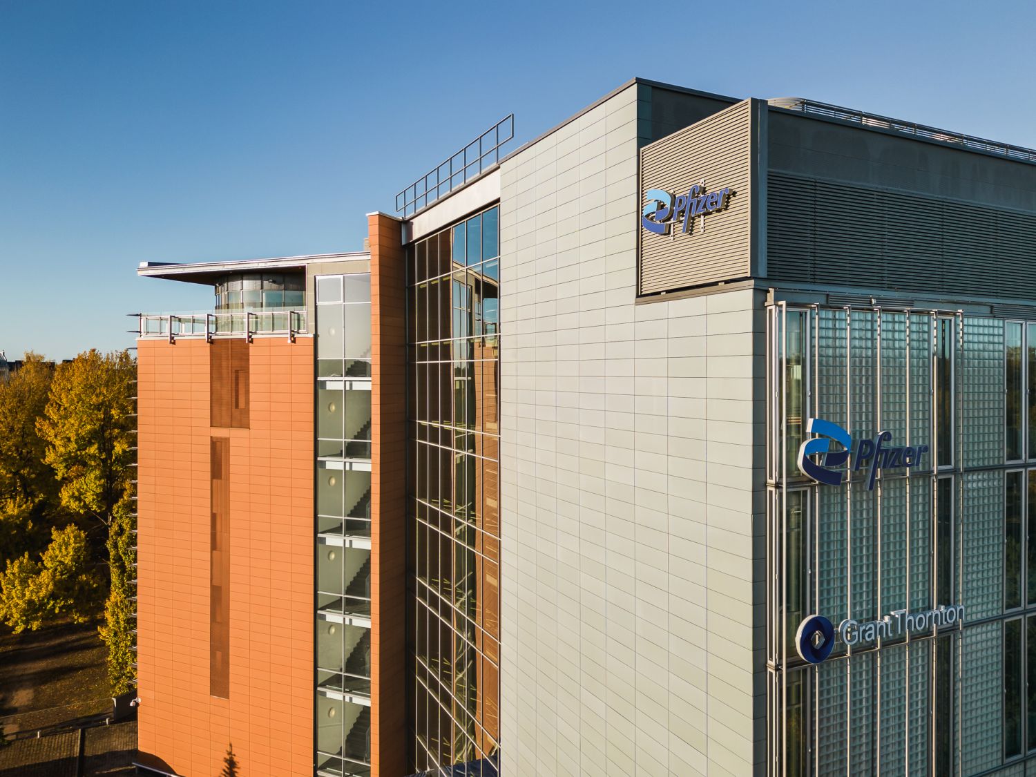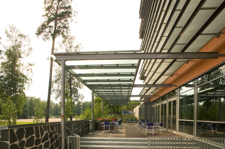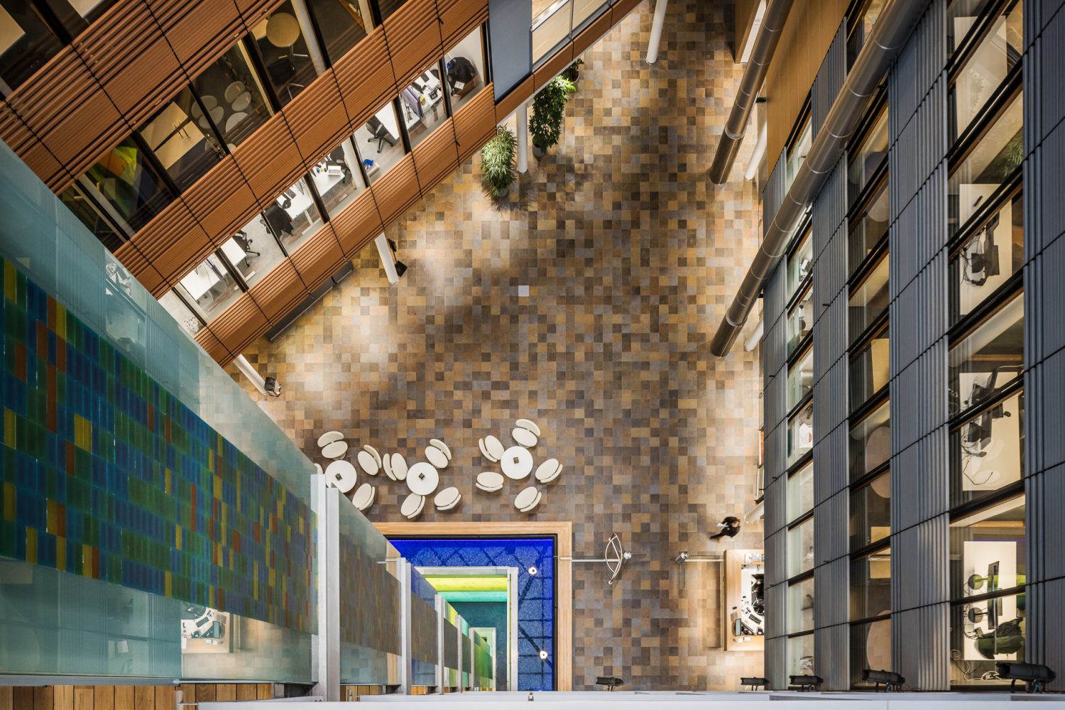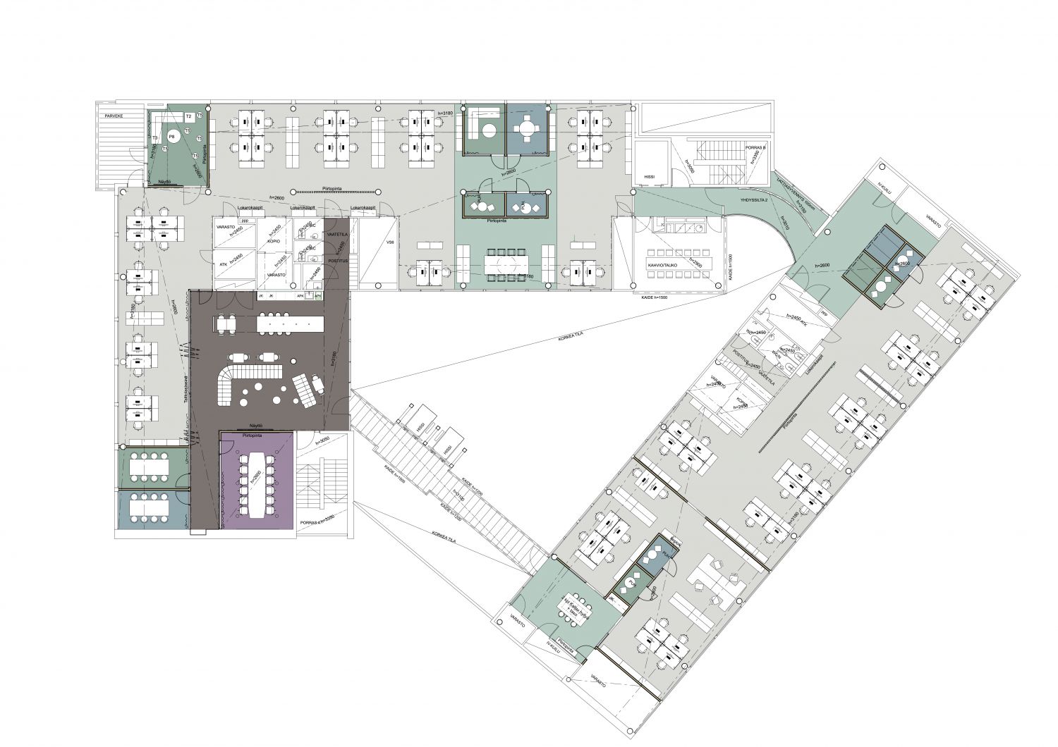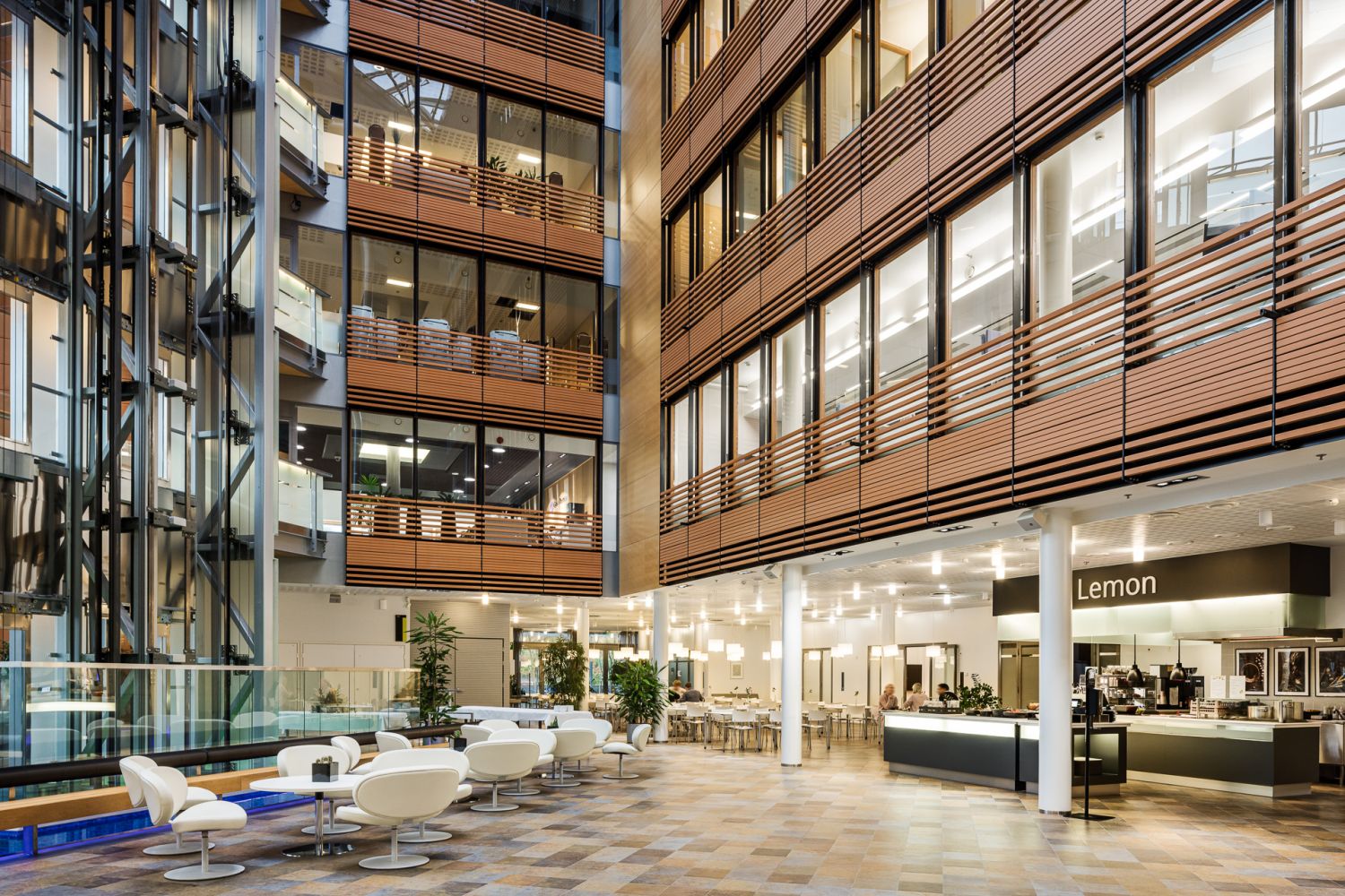 Toimistot sijoittuvat kahteen siipeen, joita yhdistää puinen silta, ja siipien välissä on upea lasinen atriumpiha, jossa on näköalahissi. Palvelut ovat todella korkealuokkaiset: hyvätasoinen ravintola, kirjasto, kuntosali ja sauna, katolla neuvottelutilat, jossa edustussauna ja terassi. Lisäksi kohteessa on jäähdytetty ilmastointi, Cat6-kaapelointi sekä erinomaiset turvallisuusstandardit.