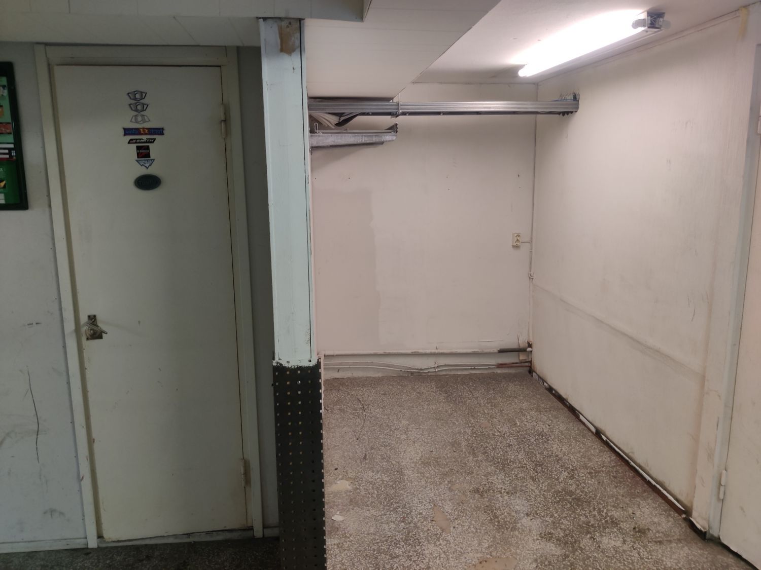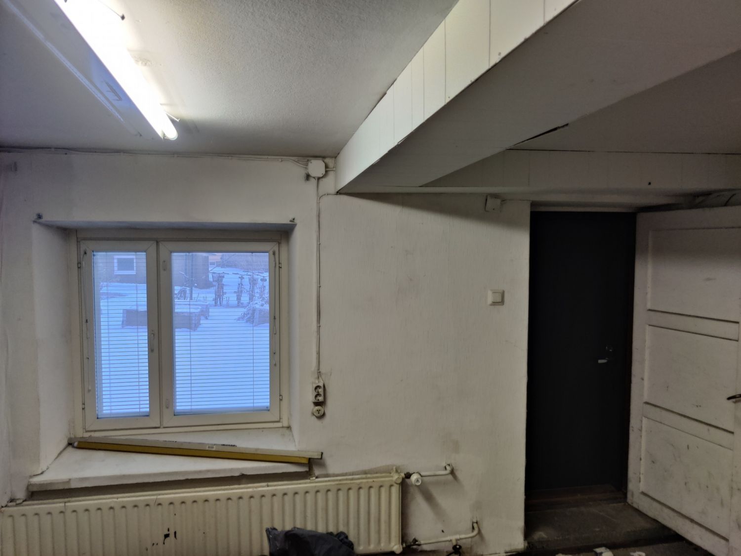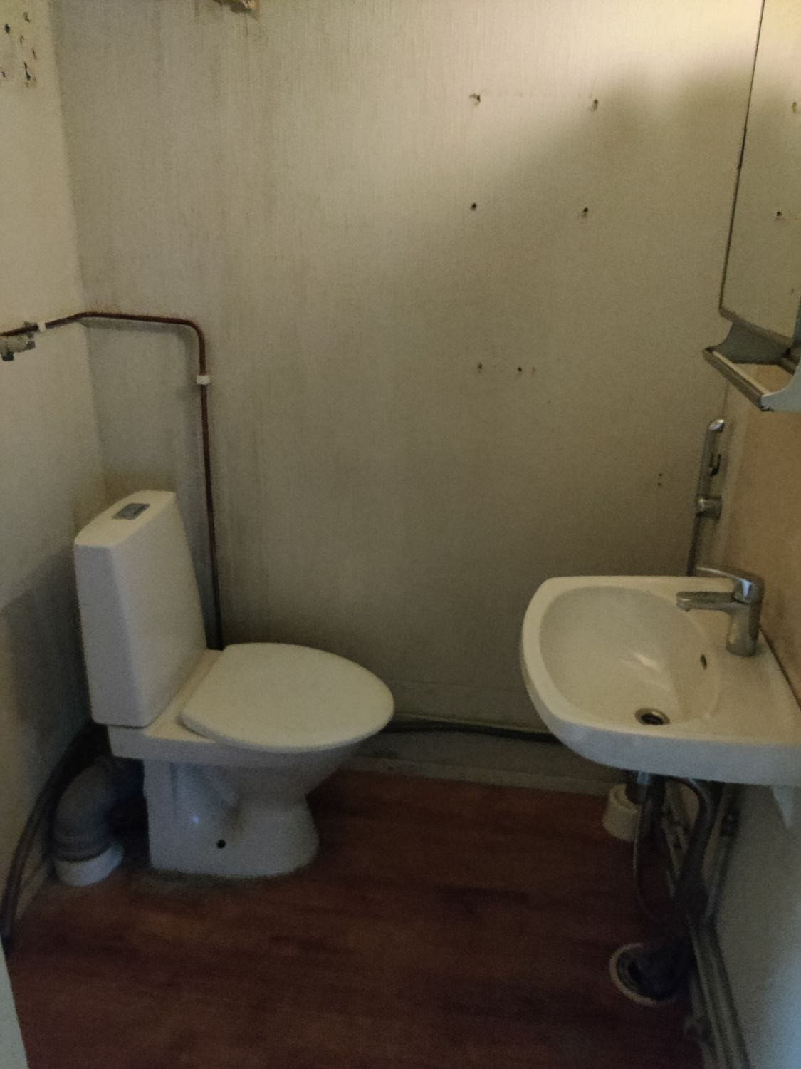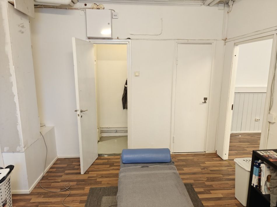 Tilan takaosassa, pari porrasta ylempänä, on wc ja huone, joka on jaettu kevyellä levyseinällä kahdeksi tilaksi. Takaosaan on myös ikkuna ja sisäänkäynti rakennuksen sivusta.