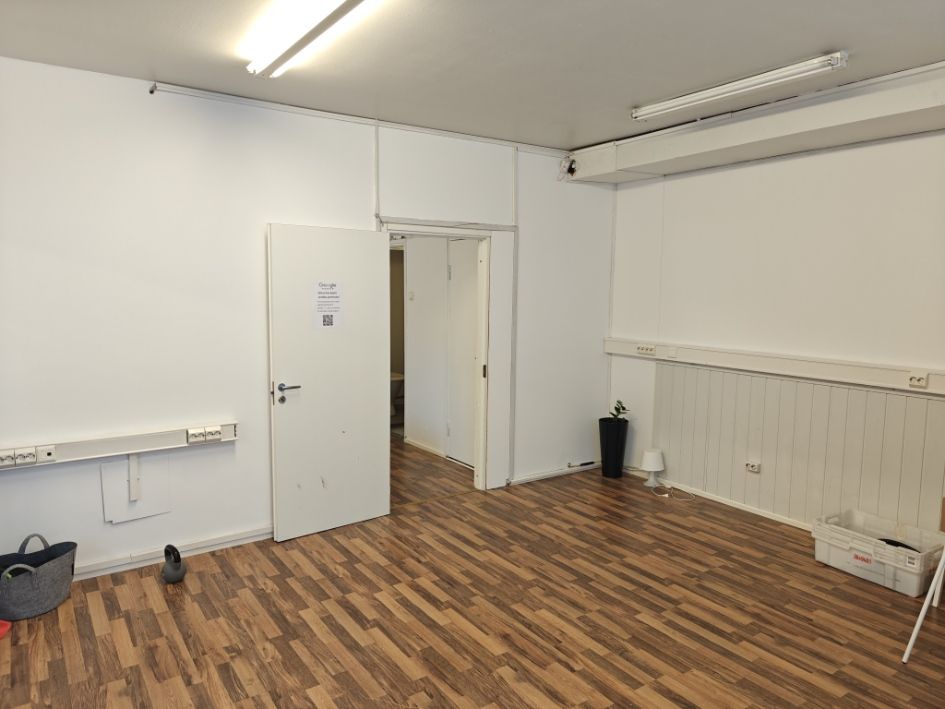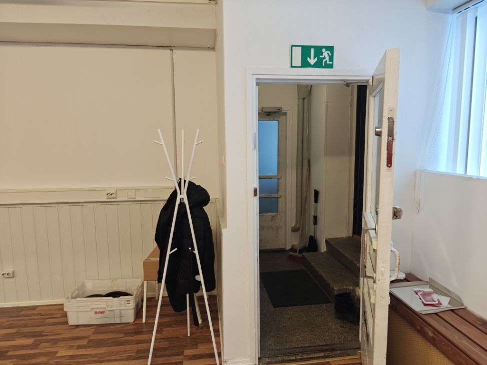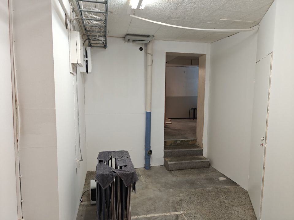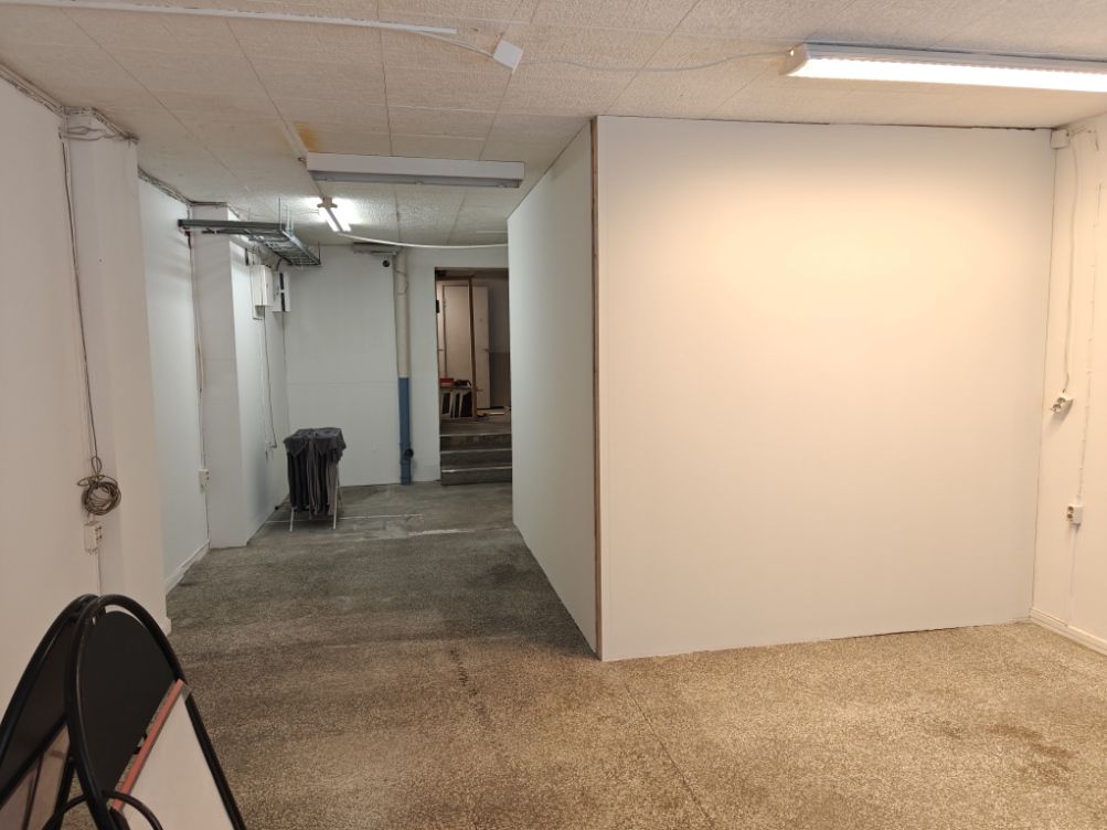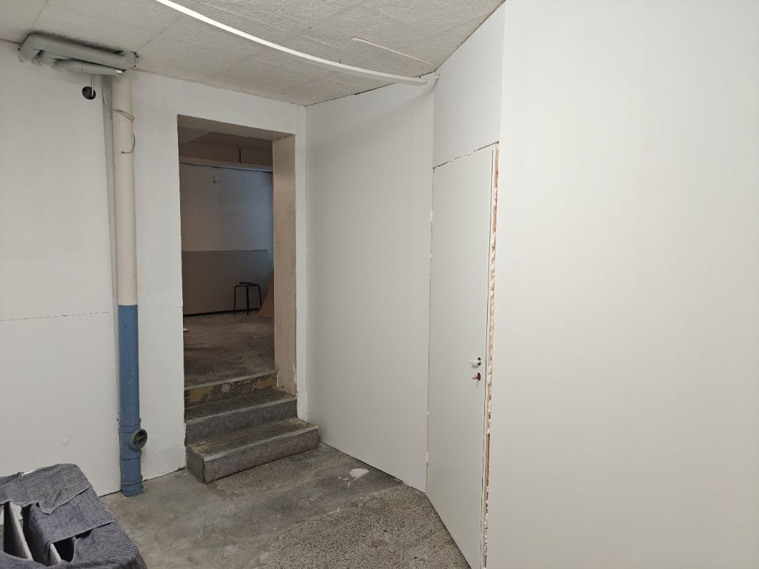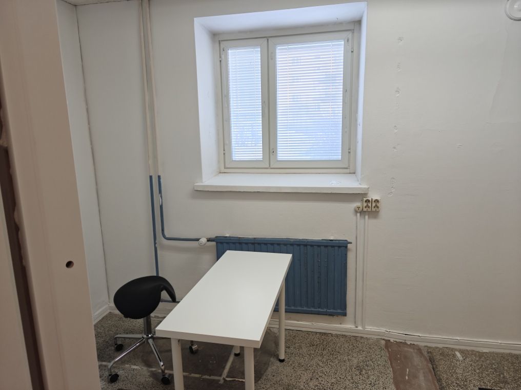 Tilan takaosassa, pari porrasta ylempänä, on wc ja huone, joka on jaettu kevyellä levyseinällä kahdeksi tilaksi. Takaosaan on myös ikkuna ja sisäänkäynti rakennuksen sivusta.