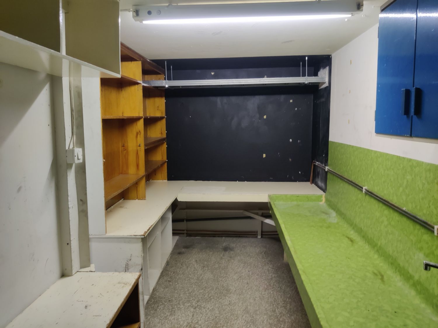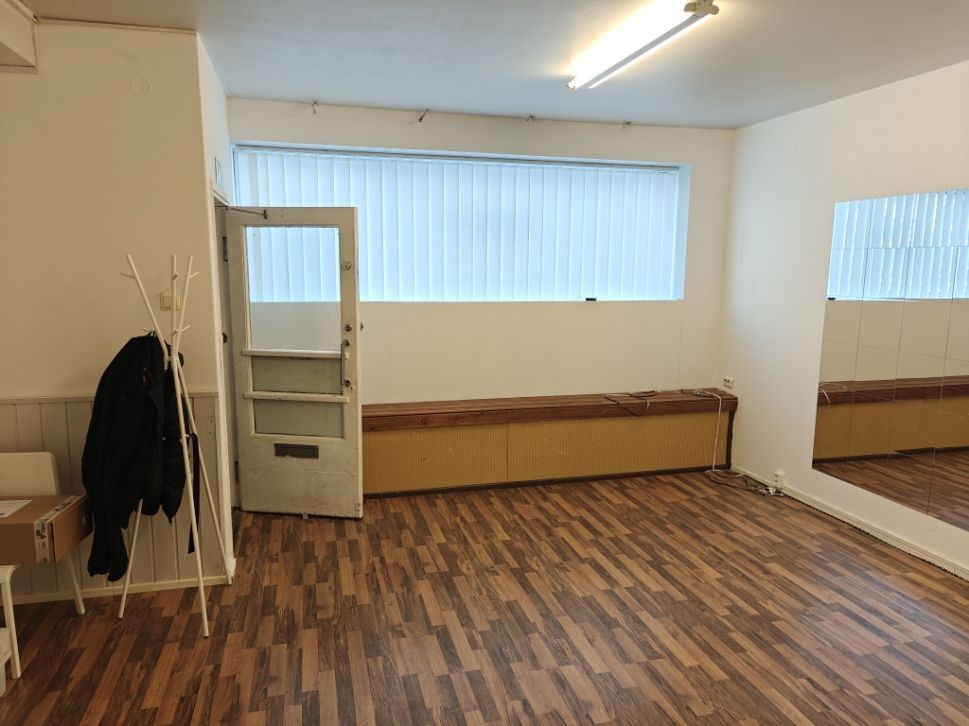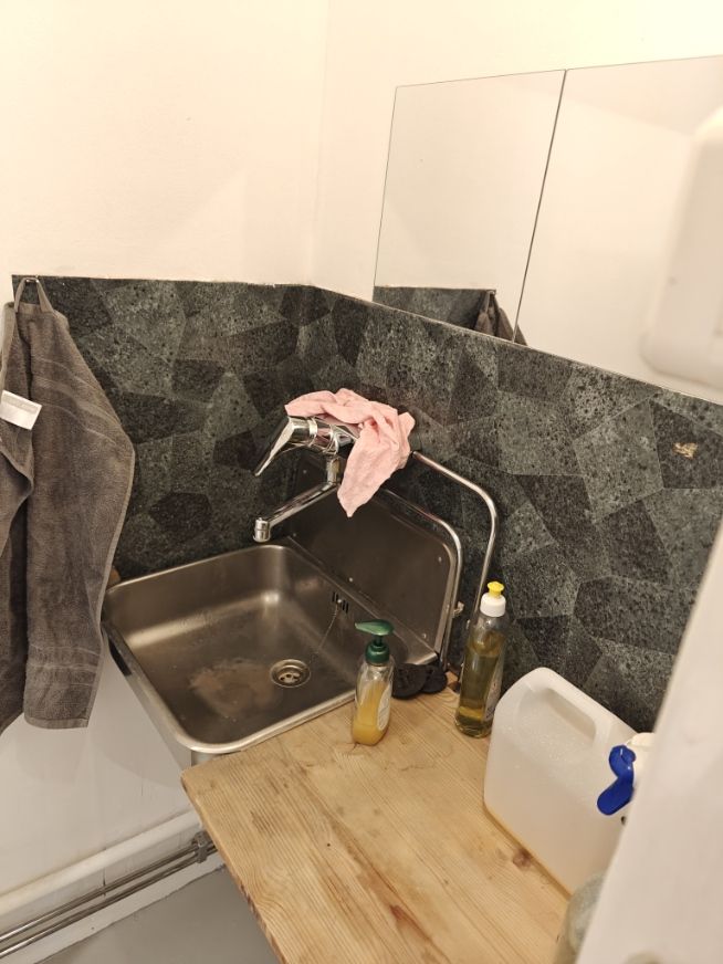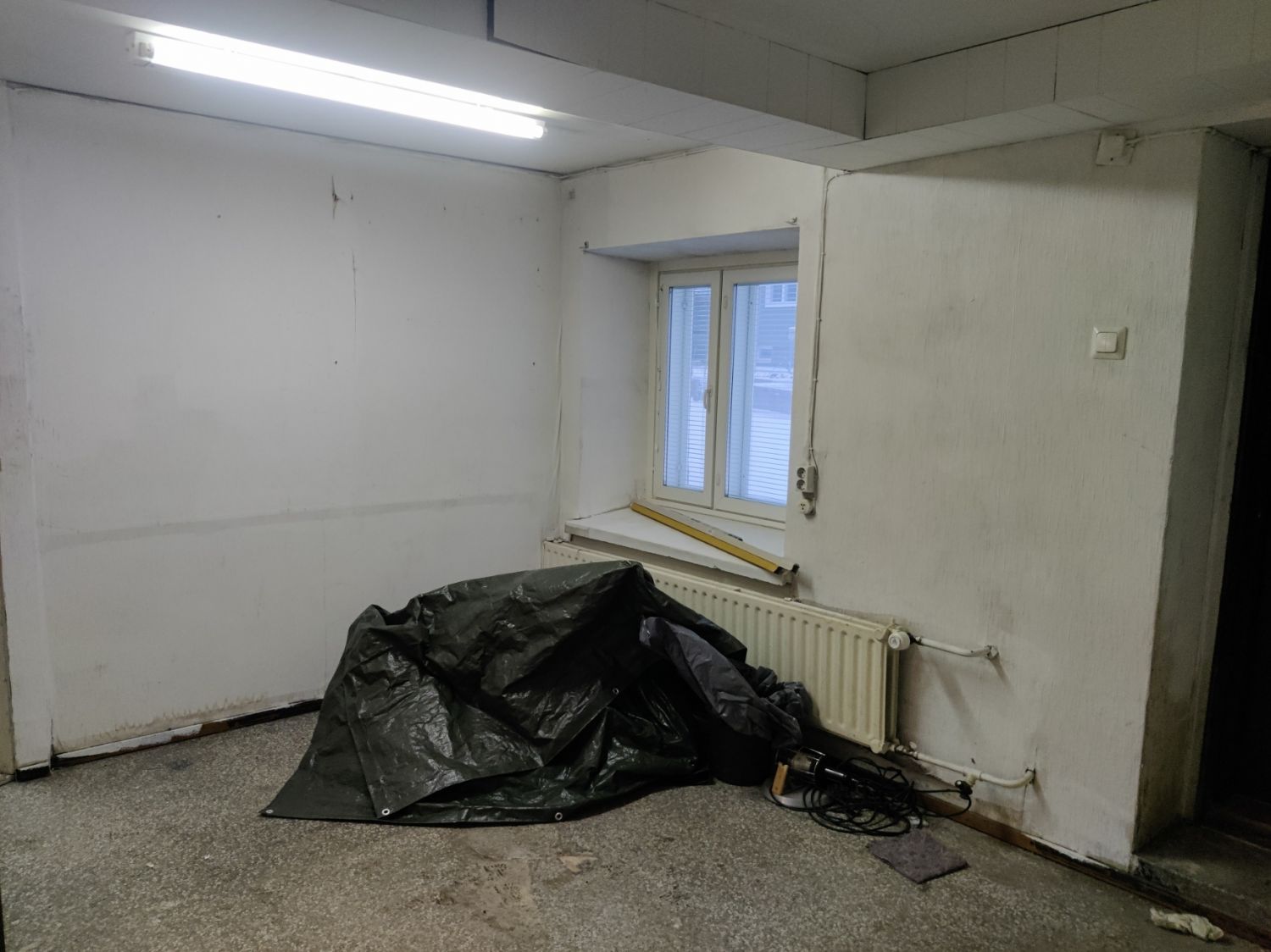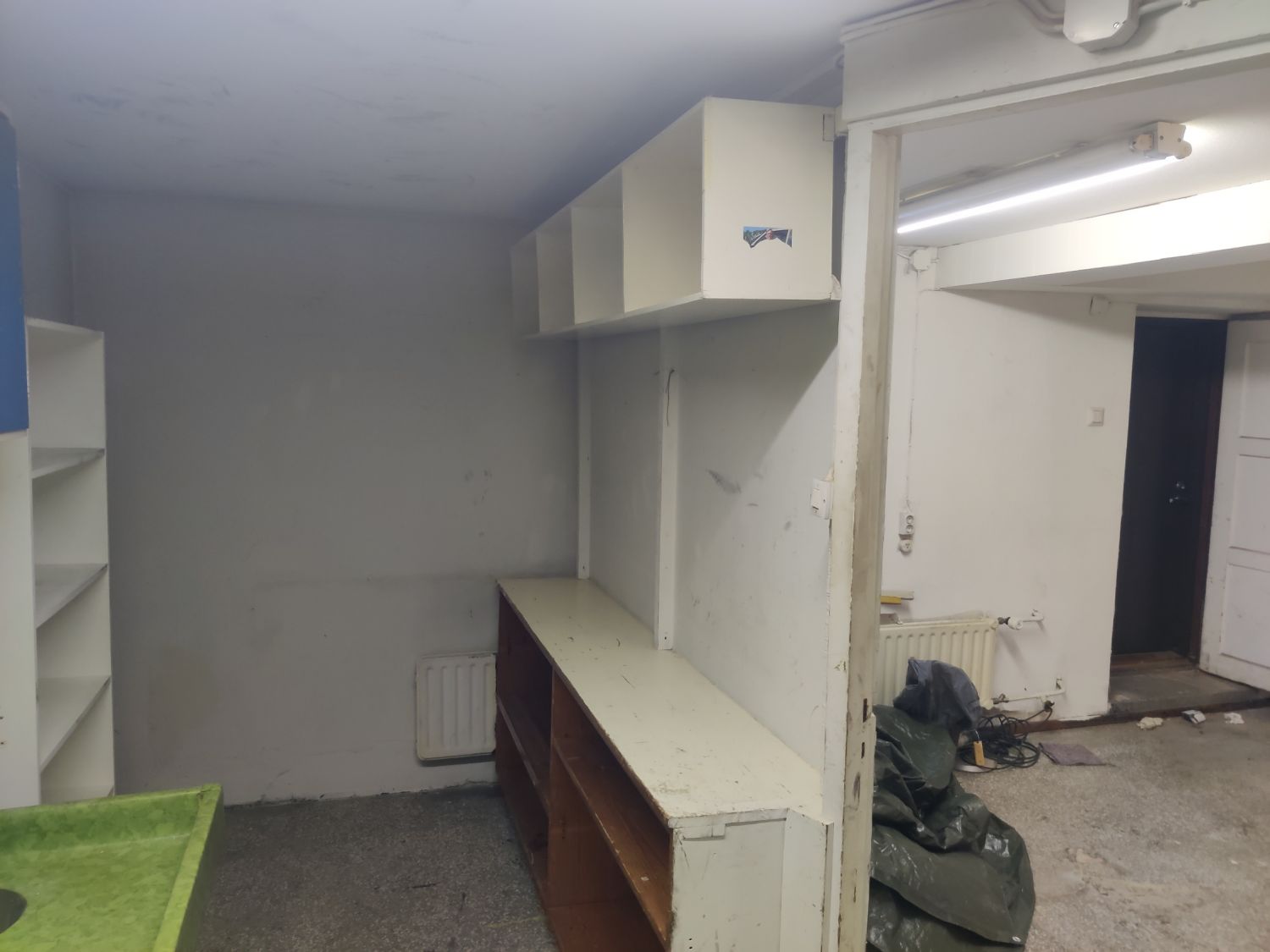 Tilan takaosassa, pari porrasta ylempänä, on wc ja huone, joka on jaettu kevyellä levyseinällä kahdeksi tilaksi. Takaosaan on myös ikkuna ja sisäänkäynti rakennuksen sivusta.