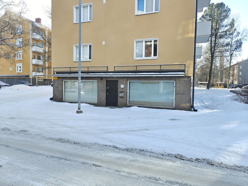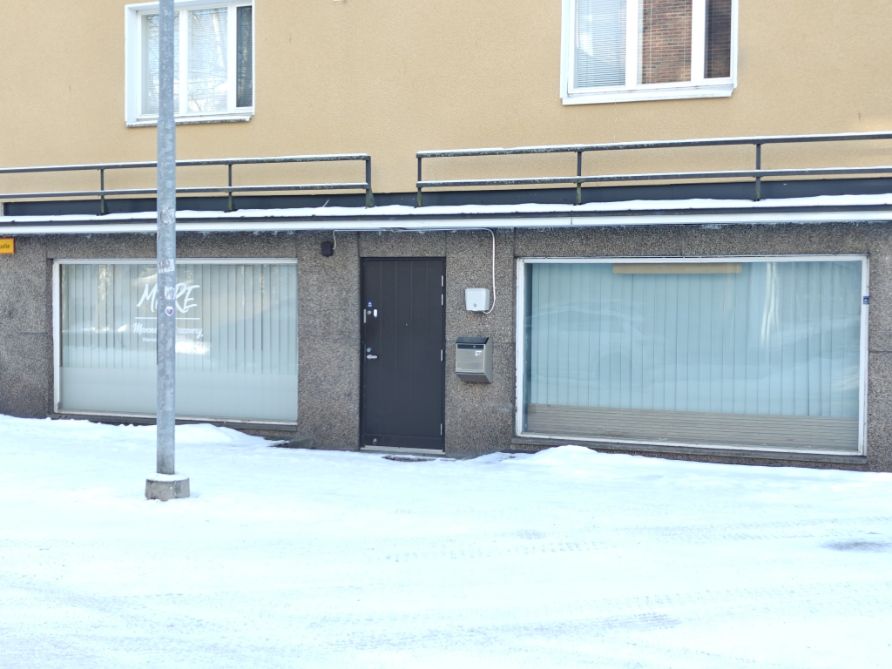 Kaskitien varrella kerrostalon päädyssä kaksi liiketilaa, joissa kummassakin iso näyteikkuna Kaskitielle.