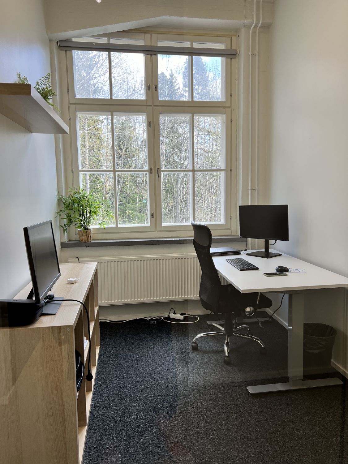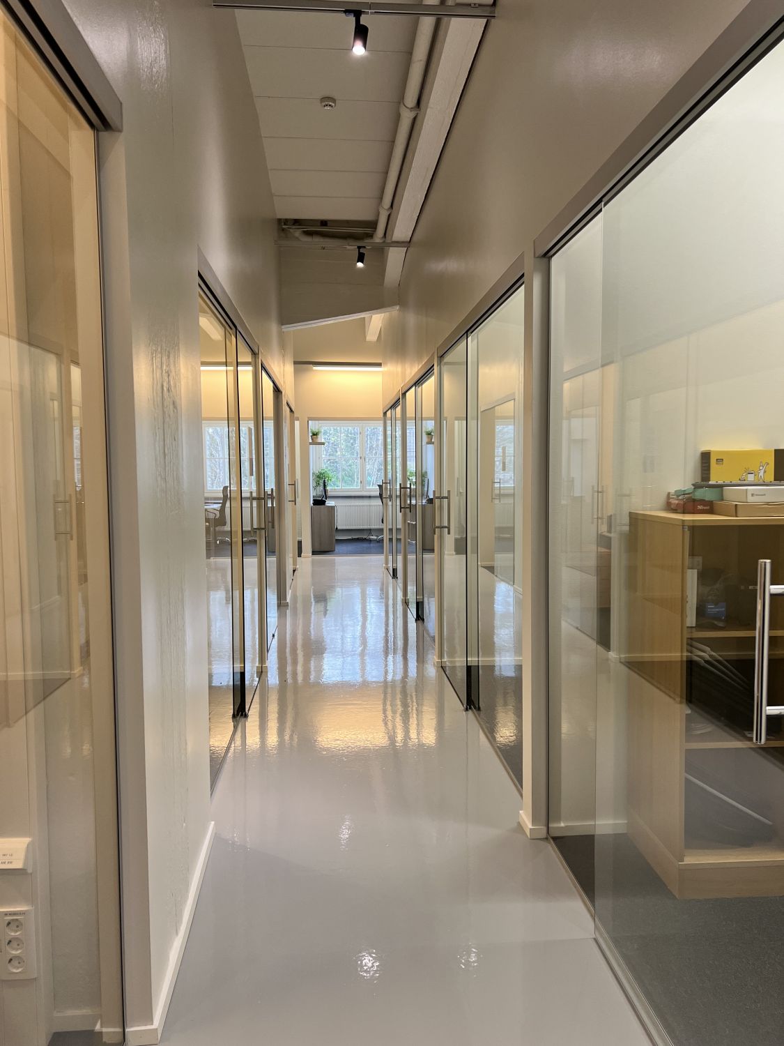 Tarjolla oleva noin 623 neliömetrin toimistotila on suunniteltu huolellisesti ja se sisältää useita toimistohuoneita, joiden koko on noin 10 neliömetriä kustakin. Tiloihin kuuluu myös useita vessoja, suihku, tilava keittiö, varasto sekä kaksi neuvotteluhuonetta. Tämä tila huokuu industrial-henkistä tunnelmaa, ja valoa tulvii sisään ikkunoista, jotka tarjoavat upeita näkymiä osittain metsämaisemalle.