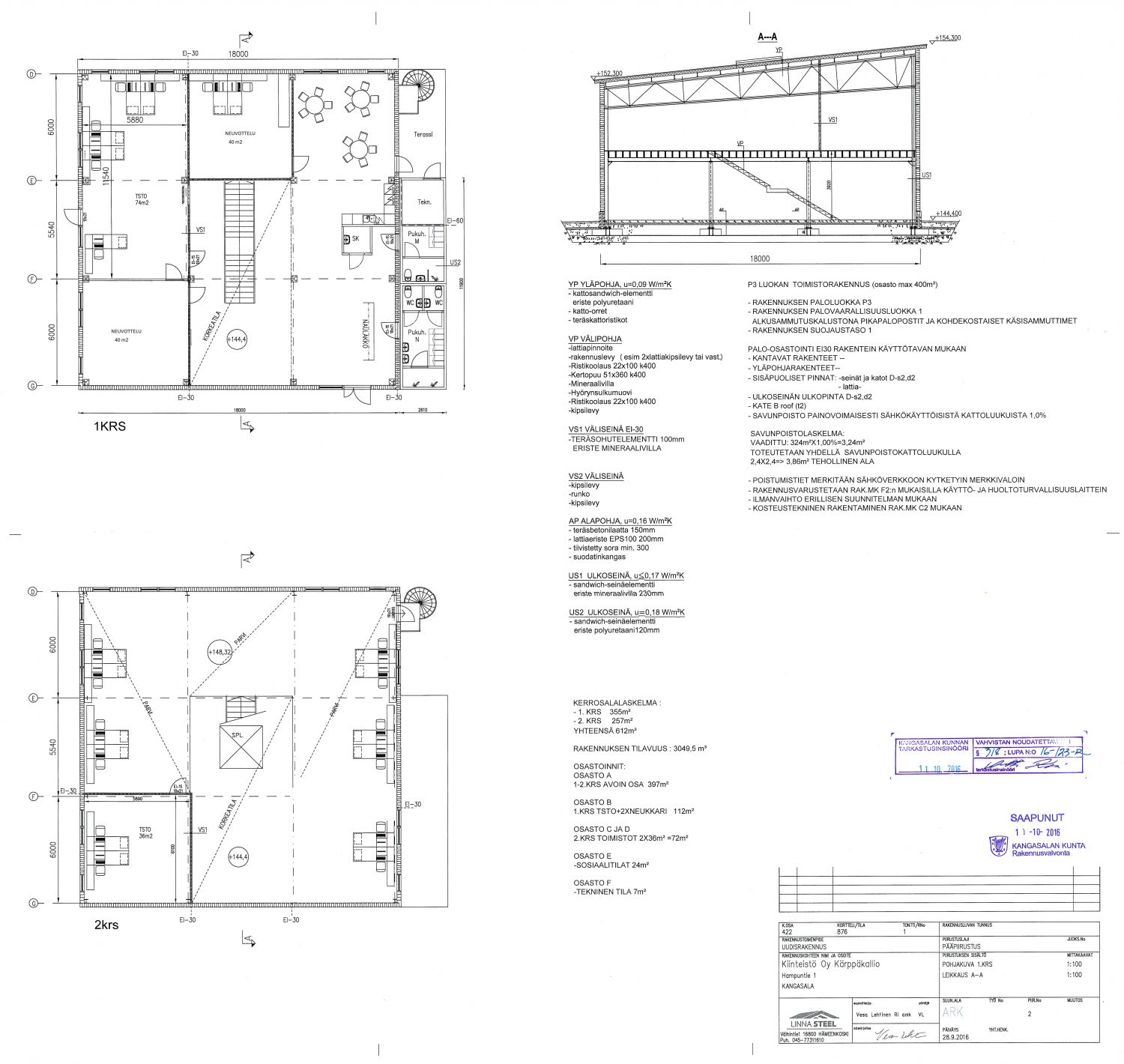 Yhteensä 612 m² laadukkaita toimistotiloja kahdessa kerroksessa.