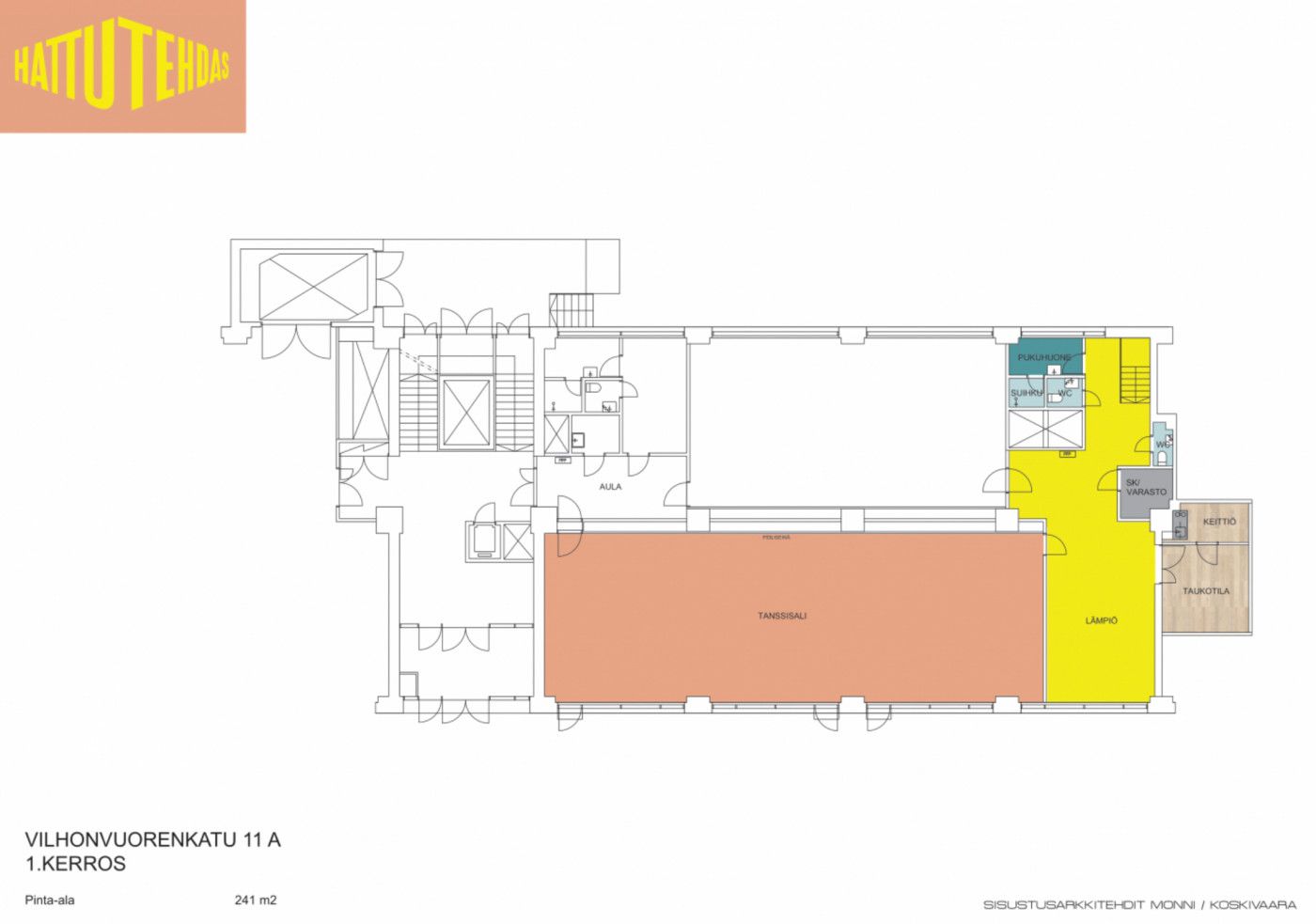 Vuokrataan 250 m2 tanssisali pukuhuoneineen Hattutehtaan 1. kerroksessa. Tila on myös yhdistettävissä suuremmaksi kokonaisuudeksi viereisen tanssisalin kanssa, jolloin vuokrattavia neliöitä on yhteensä 392 m2.