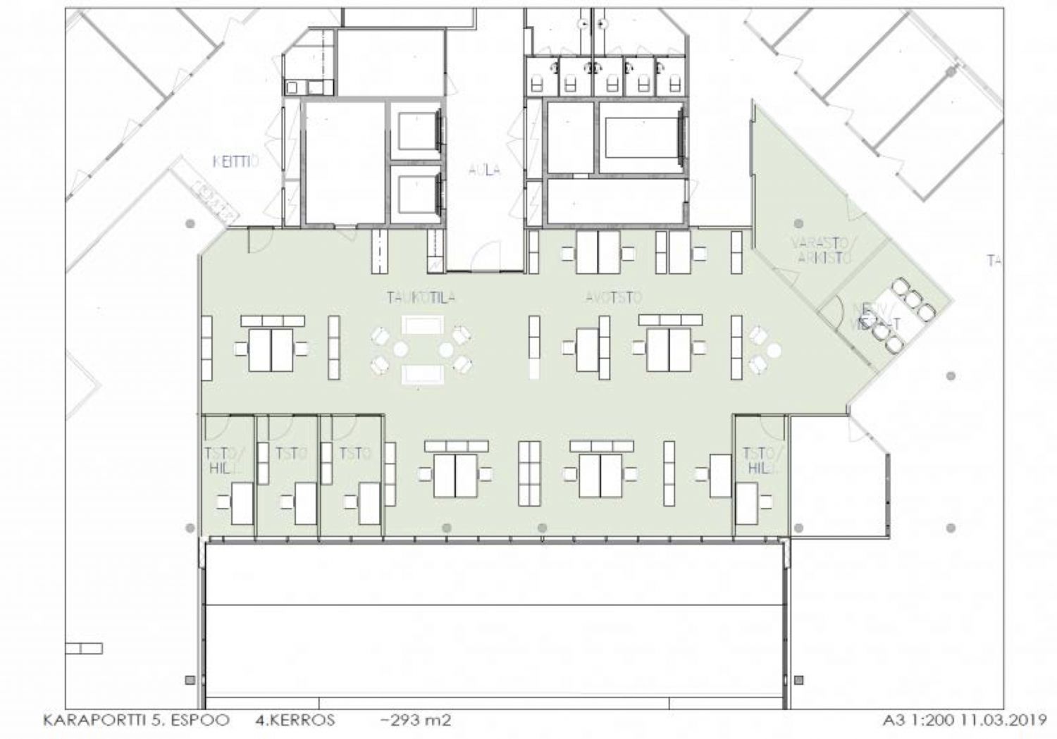 Kolmannessa ja neljännessä kerroksessa on tarjolla uudenlaista yhteisöllistä toimistotilaa. Yritysten käytössä on tyylikkäät ja viihtyisät aula- ja taukotilat keittiöineen. Toimistotilojen lisäksi kohteessa on pienempiä studioita sekä erilaisia neuvottelu- ja projektityötiloja, joita vuokrataan kaikenkokoisille yrityksille.