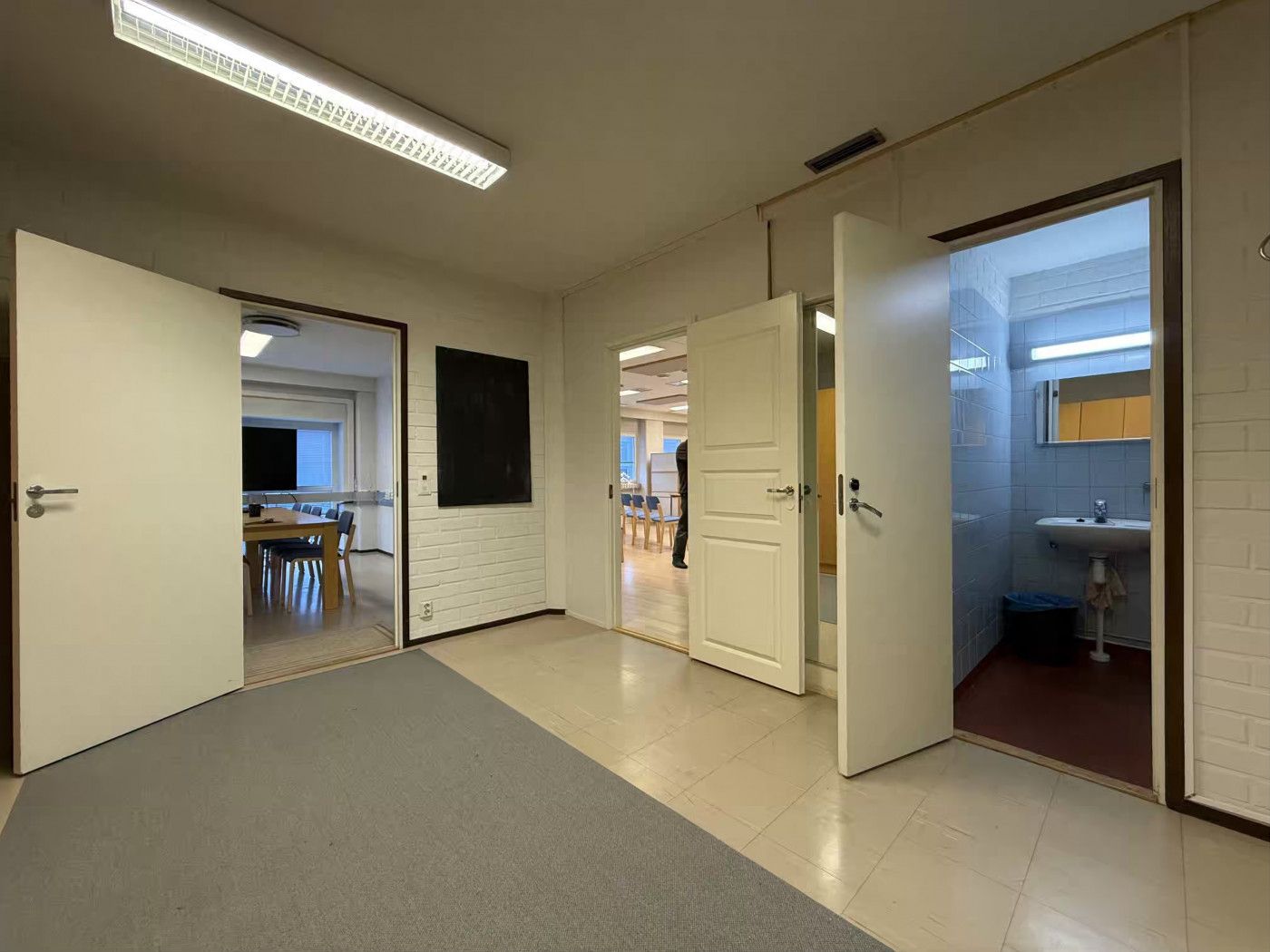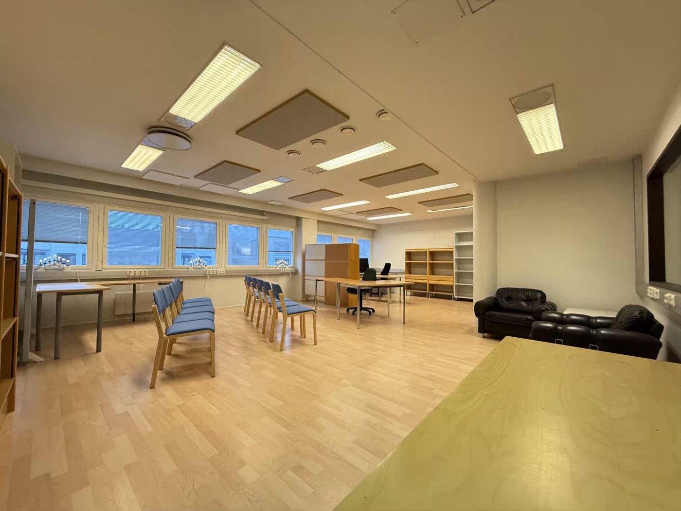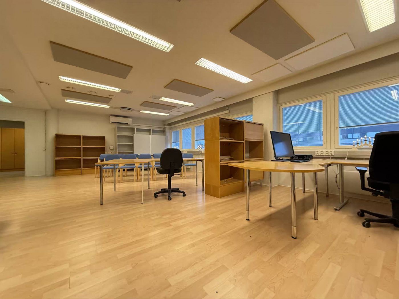 Huoneisto on pääosin avointa tilaa, jonka lisäksi tilassa on keittiö, neuvotteluhuone, varastotilaa, sisäänkäyntiaula ja wc. Tila soveltuu hyvin toimistokäyttöön. Huoneiston on mahdollista yhdistää viereiseen 140 m2 tilaan.