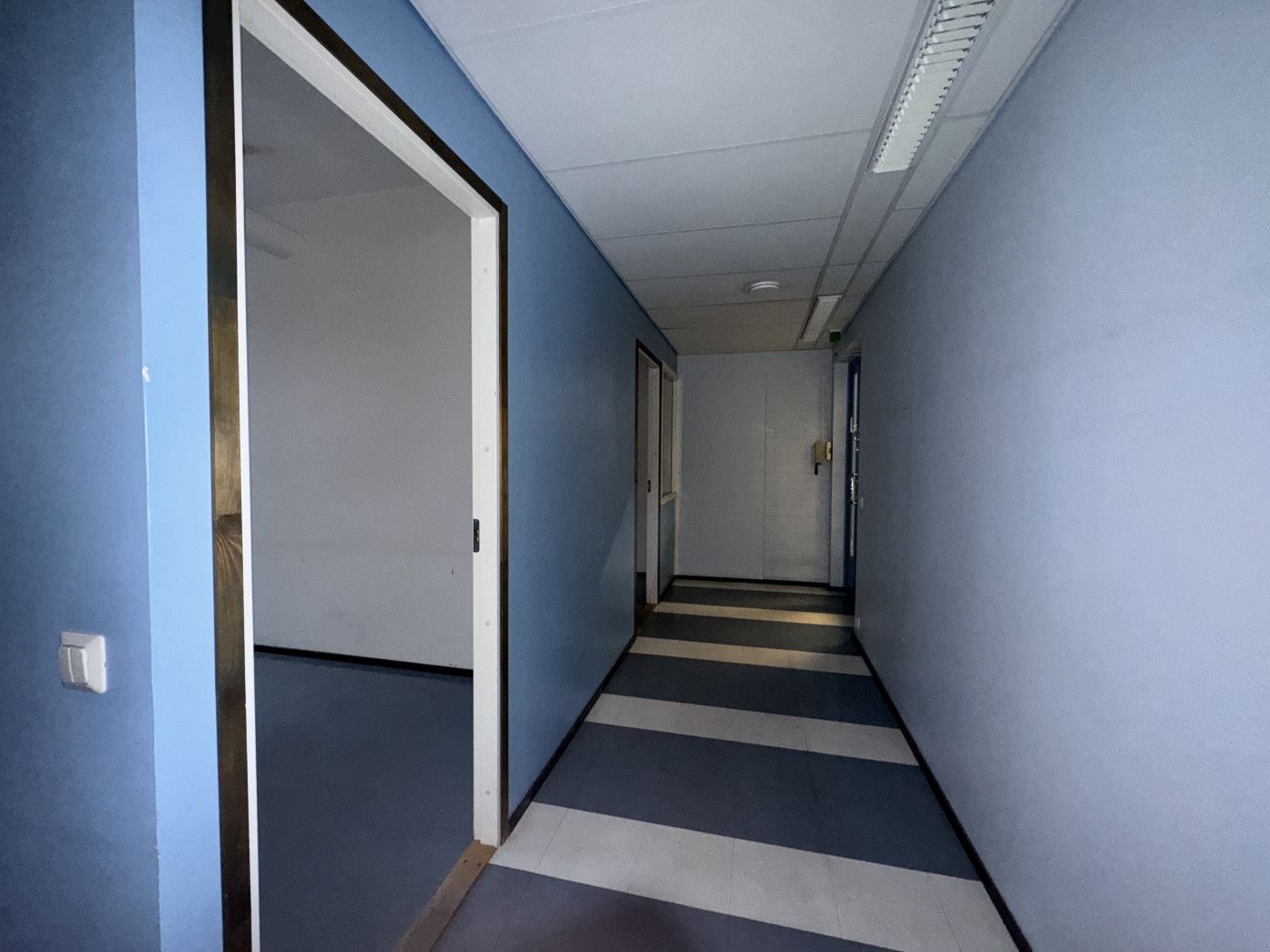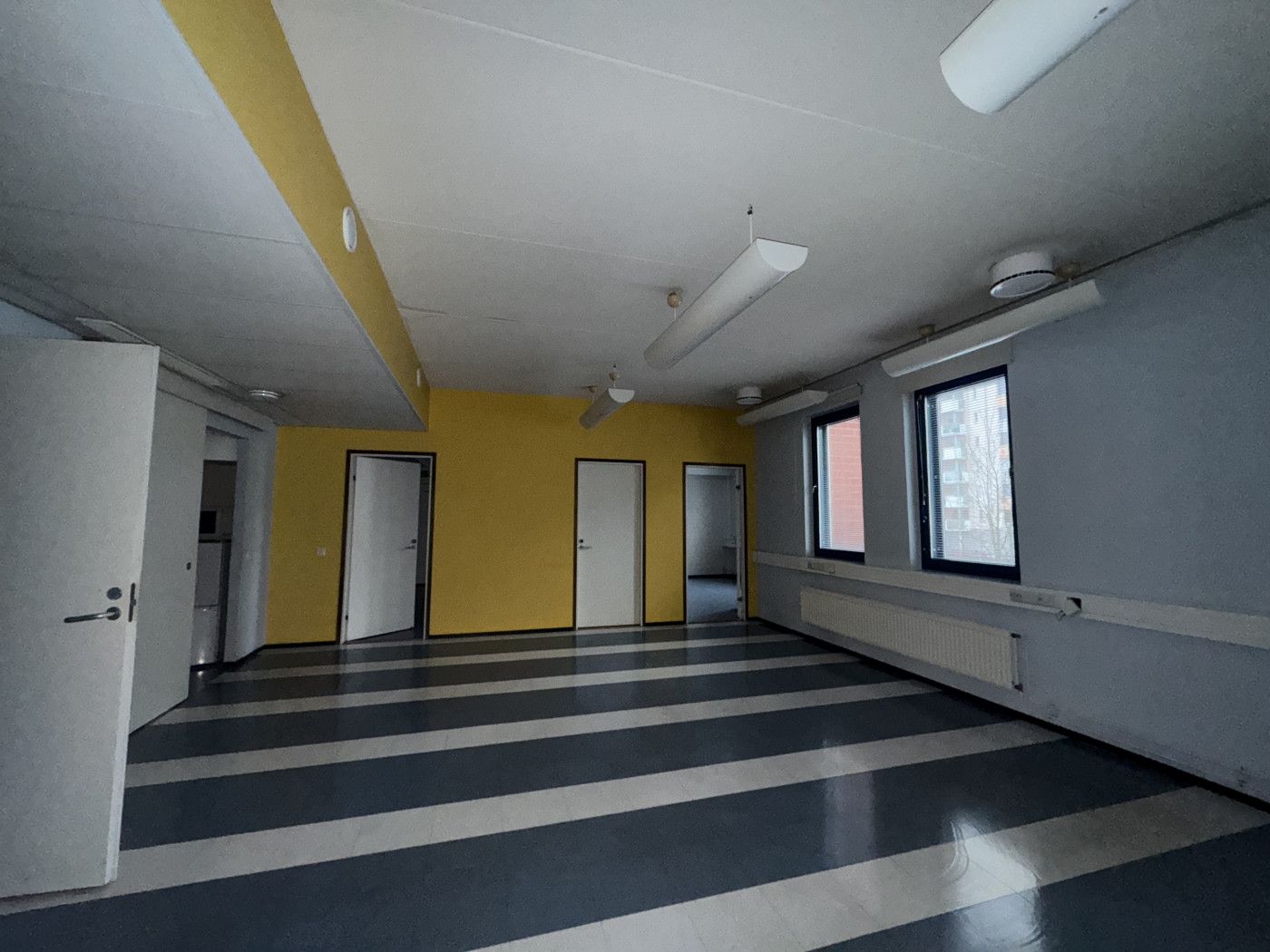 Yksi iso huone, tilava neuvotteluhuone tms, kaksi n. 10 m2 huonetta, keittiö, 2 WC:tä.