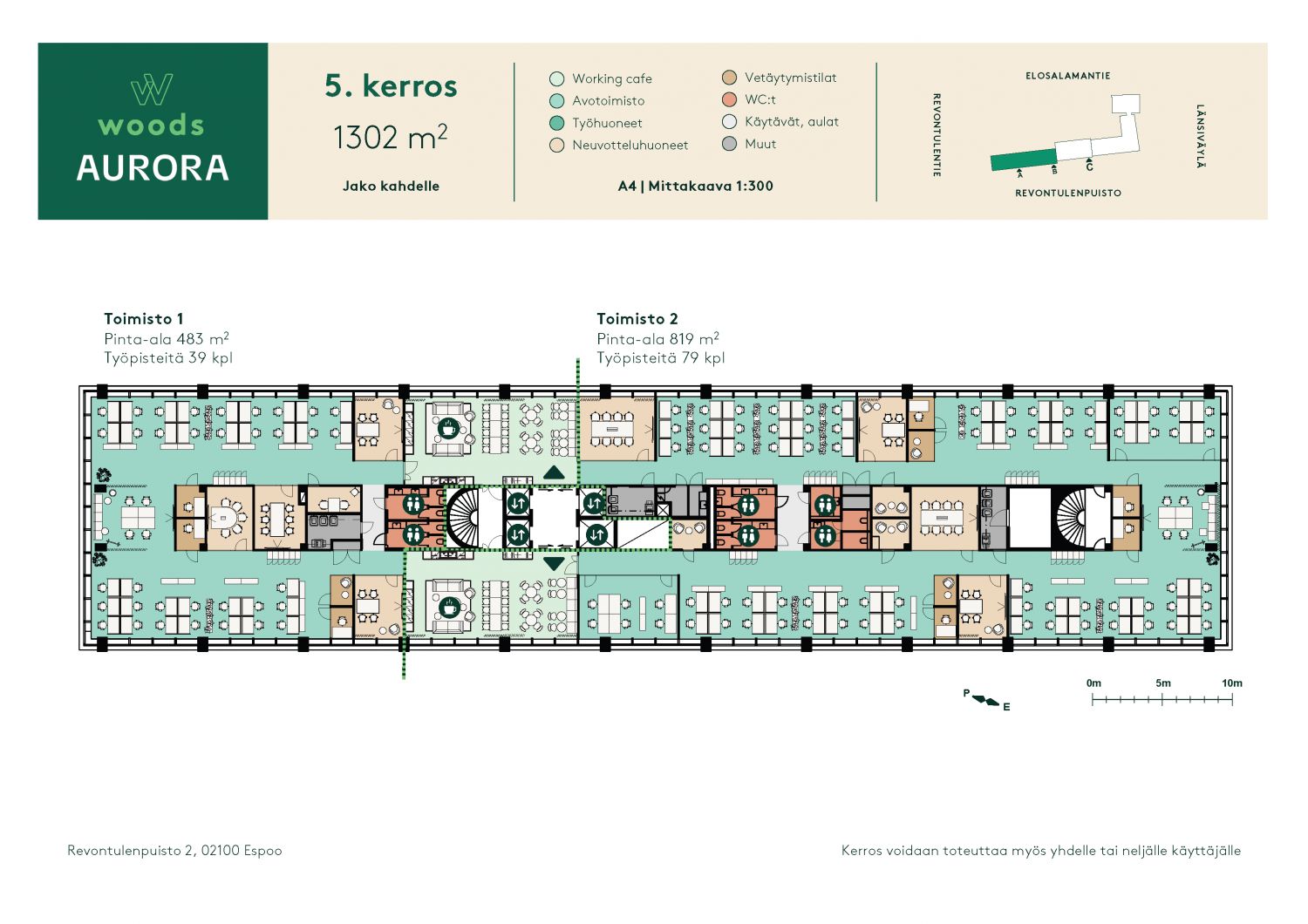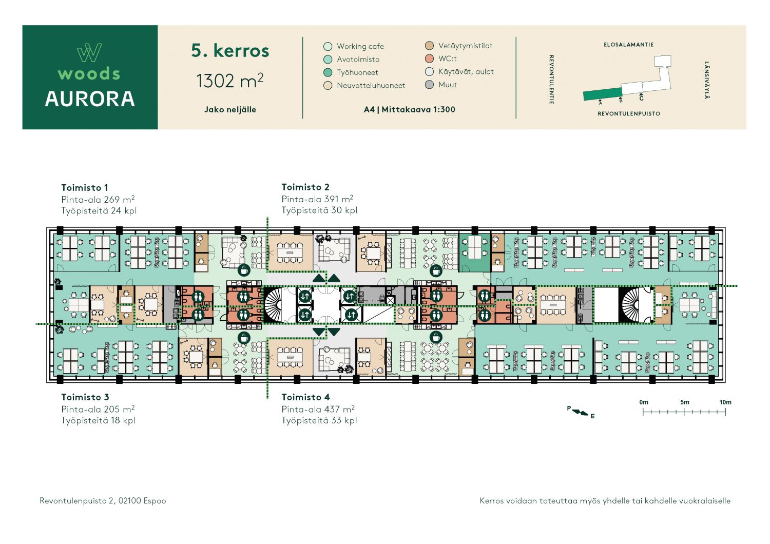 Kerroskoko n. 1300 m2, joka voidaan jakaa 4 osaan