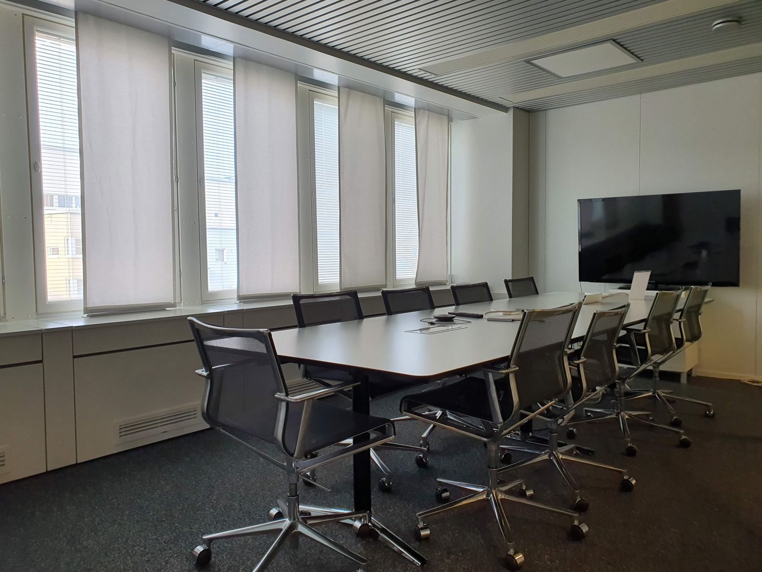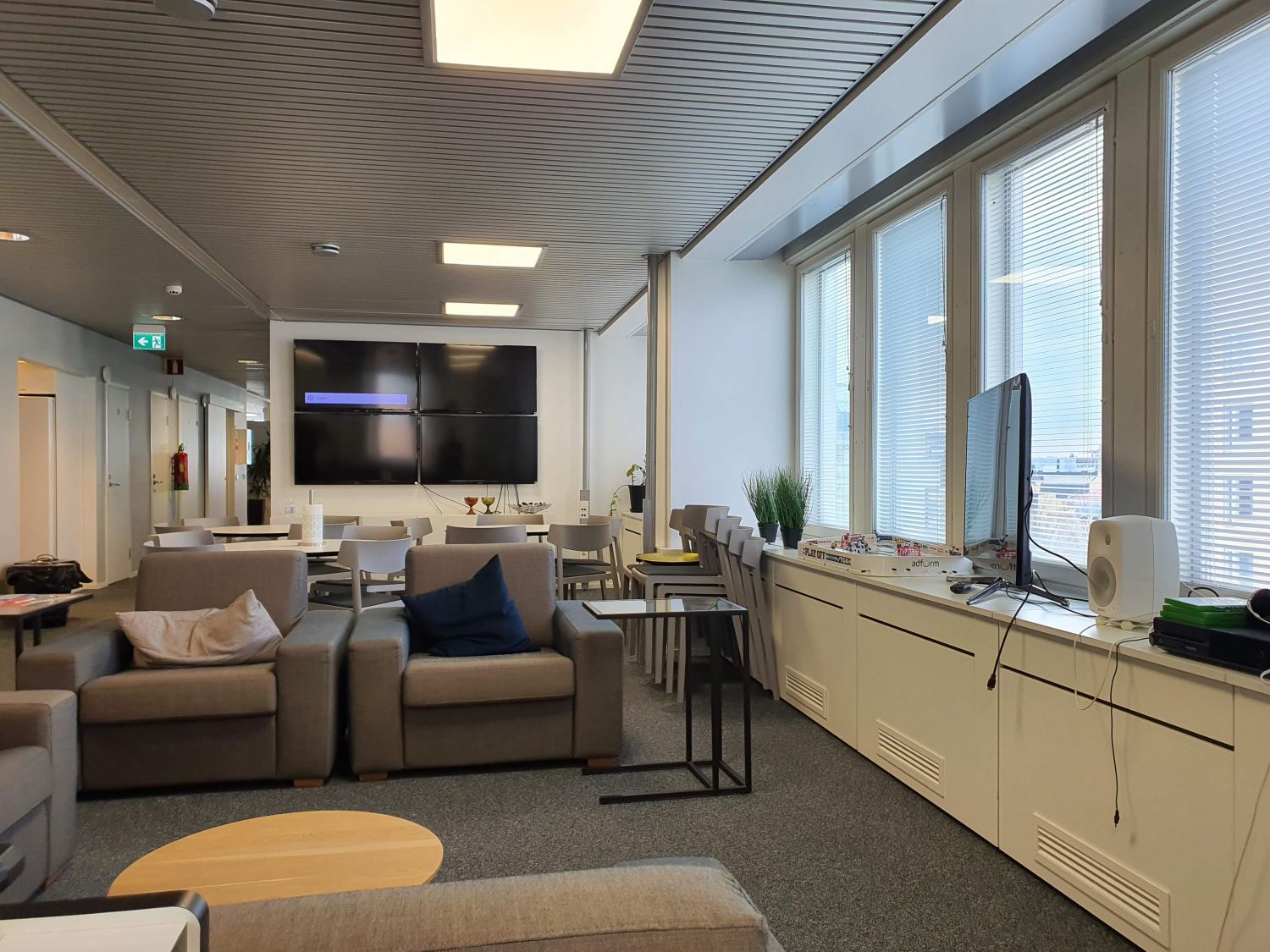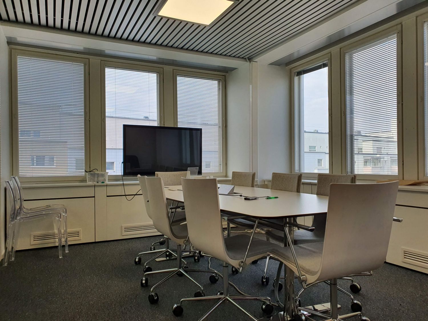 Tässä 6. krs toimistotilassa on iso ja pienempi avotila, useita erikokoisia neuvottelu-/teams-huoneita, wc- ja keittiötiloja.