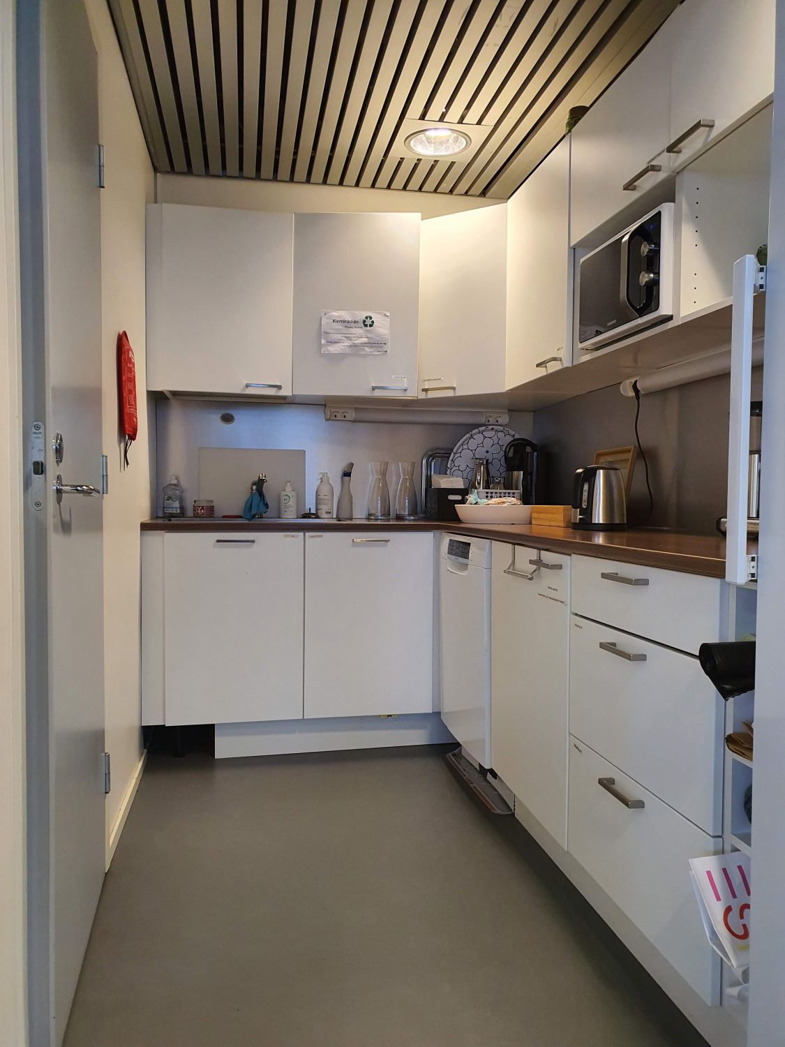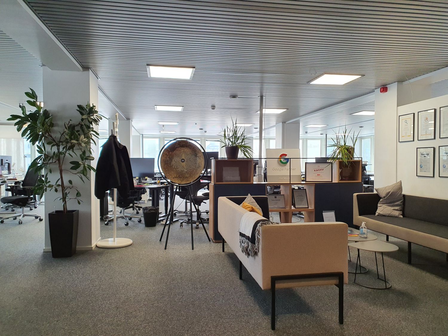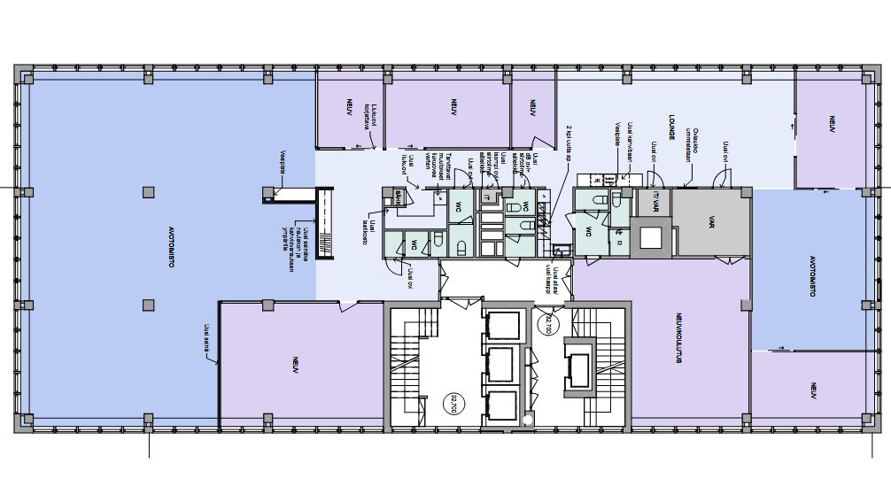 Tässä 6. krs toimistotilassa on iso ja pienempi avotila, useita erikokoisia neuvottelu-/teams-huoneita, wc- ja keittiötiloja.