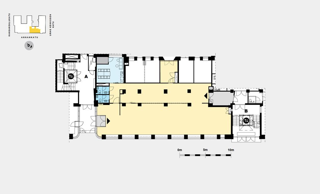 Sijainti erinomaisella liikepaikalla kaiken keskellä ja suuret ikkunat takaavat toiminnalle huomattavan näkyvyyden. Tilaan sisäänkäynti Annankadulta.