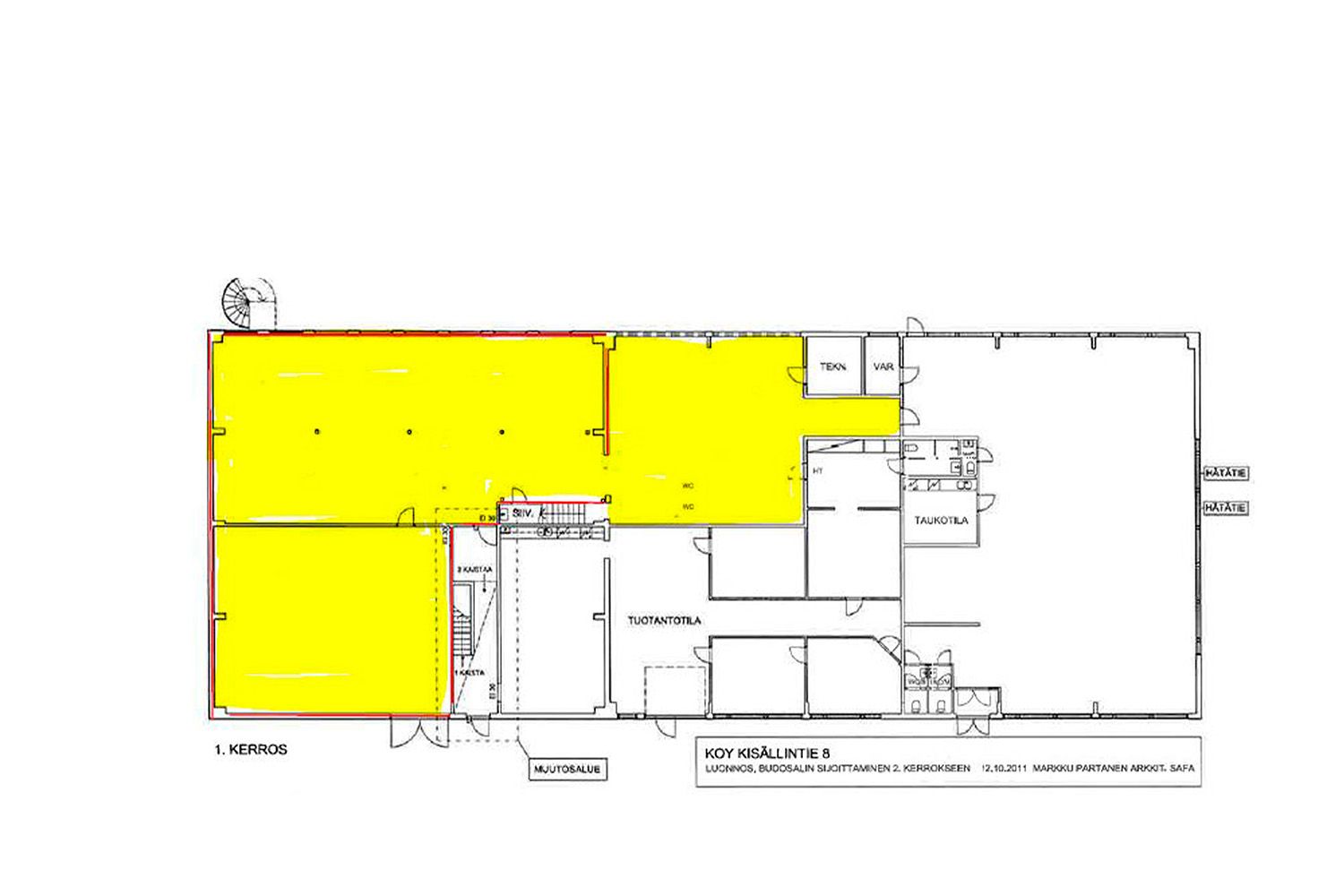 Halli on pinta-alaltaan yhteensä noin 395 m² ja se on tällä hetkellä pääosin avonaista tilaa. Hallin pohja on toimiva ja tila on kätevä jakaa kevyin väliseinin useampaan tilaan. Hallin sisäkorkeus on etuosassa noin 5 metriä ja välissä matalampaa sekä taas takaosassa korkeampaa tilaa (katso pohjakuvasta tarkemmin). Tilaan on yksi iso nosto-ovi (L3,9 m x K3,9 m) sekä erillinen käyntiovi. Hallin ensimmäisessä kerroksessa on wc ja toisessa kerroksessa hyvänkokoinen taukotila/toimistotila pinta-alaltaan 51 m², jonka ikkunanäkymä sisäpihalle päin.