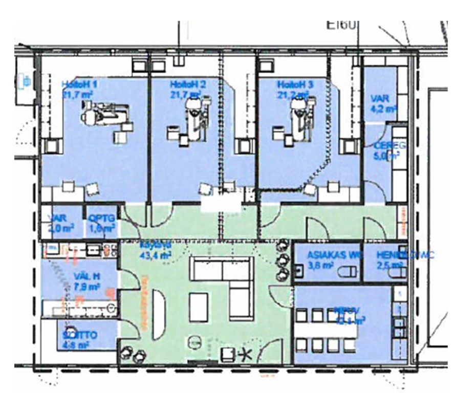 Vuokrattavana 178 m² toimitila kiinteistön 1. kerroksesta. Tila on valmis hammaslääkäriasema, mutta se soveltuu hyvin myös muuhun terveydenhuollon toimintaan. Tilassa on kolme hoitohuonetta, aulatila sekä keittiö- ja wc-tilat. Neliömäärään sisältyy jyvitys yhteiskäyttöisistä tiloista.