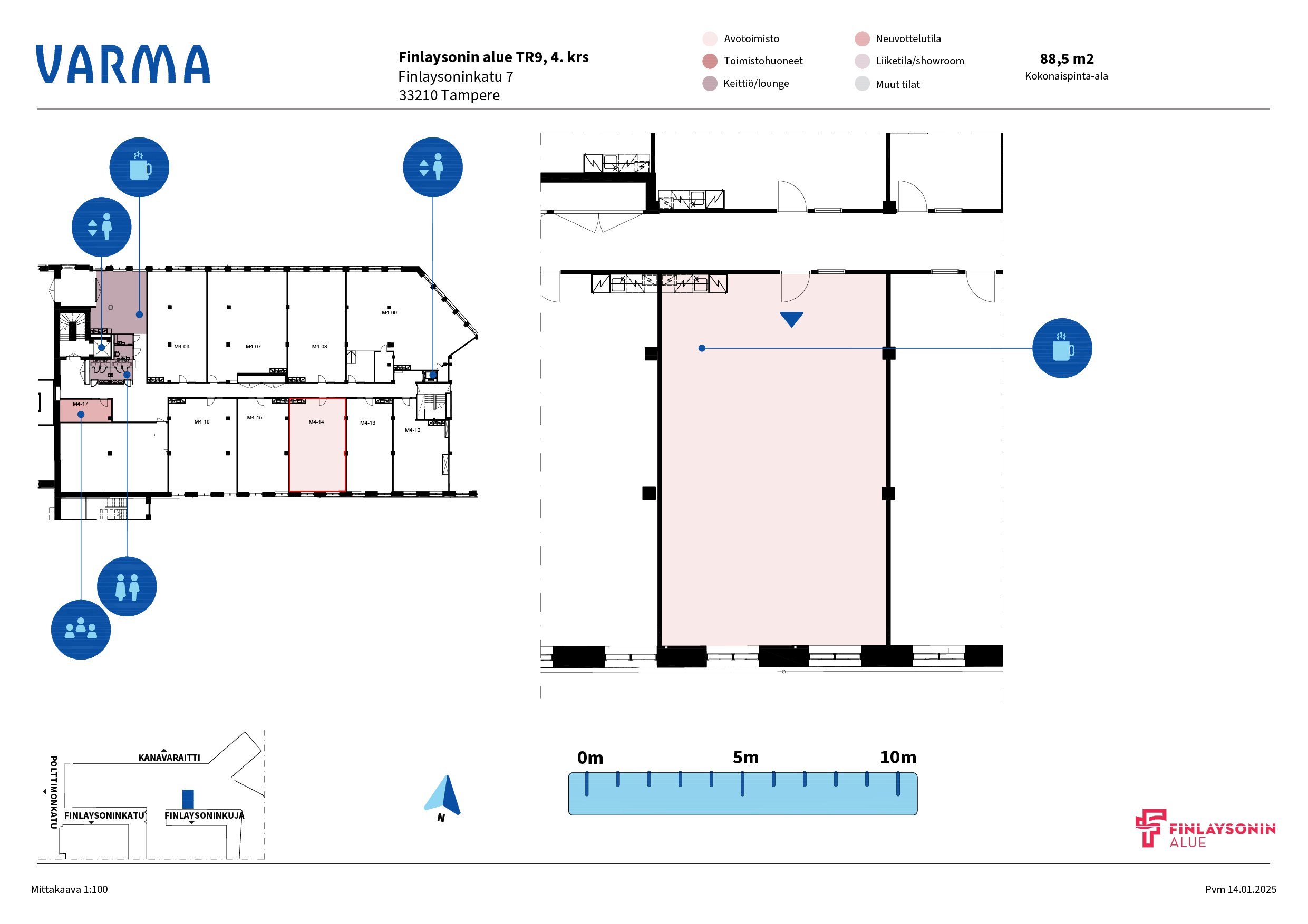 Perinteikäs Finlaysonin alue on vireä liike-elämän, vapaa-ajan ja kulttuuritapahtumien keskus, jossa toimivissa yli 100 yrityksessä työskentelee ja asioi päivittäin tuhansia ihmisiä. Alueen useat ravintolat ja kahvilat mahdollistavat maukkaat lounas- ja kahvihetket. Finlaysonin alueen vanhat tehdasrakennukset tarjoavat yrityksellesi uniikin toimintaympäristön Tammerkosken maisemissa. Alueen rakennukset ovat BREEAM In-Use -ympäristösertifioituja arvosanalla Very Good. Finlaysonin alue on helposti saavutettavissa omalla autolla, julkisin kulkuvälinein ja kevyellä liikenteellä. Keskustori ja rautatieasema ovat kävelymatkan etäisyydellä. Avotoimistotila, jossa oma minikeittiönurkkaus. Vuokralaisten yhteiskäytössä on varaustilanne huomioiden ilman erillisveloitusta 3. ja 4. kerroksessa sijaitsevat neuvottelutilat sekä taukokeittiö ja wc-tilat.