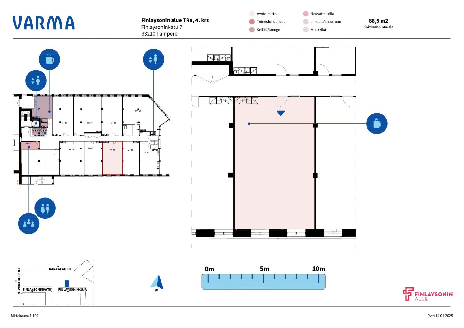 Perinteikäs Finlaysonin alue on vireä liike-elämän, vapaa-ajan ja kulttuuritapahtumien keskus, jossa toimivissa yli 100 yrityksessä työskentelee ja asioi päivittäin tuhansia ihmisiä. Alueen useat ravintolat ja kahvilat mahdollistavat maukkaat lounas- ja kahvihetket. Finlaysonin alueen vanhat tehdasrakennukset tarjoavat yrityksellesi uniikin toimintaympäristön Tammerkosken maisemissa. Finlaysonin alue on helposti saavutettavissa omalla autolla, julkisin kulkuvälinein ja kevyellä liikenteellä. Keskustori ja rautatieasema ovat kävelymatkan etäisyydellä. Avotoimistotila, jossa oma minikeittiönurkkaus. Vuokralaisten yhteiskäytössä on varaustilanne huomioiden ilman erillisveloitusta 3. ja 4. kerroksessa sijaitsevat neuvottelutilat sekä taukokeittiö ja wc-tilat.
