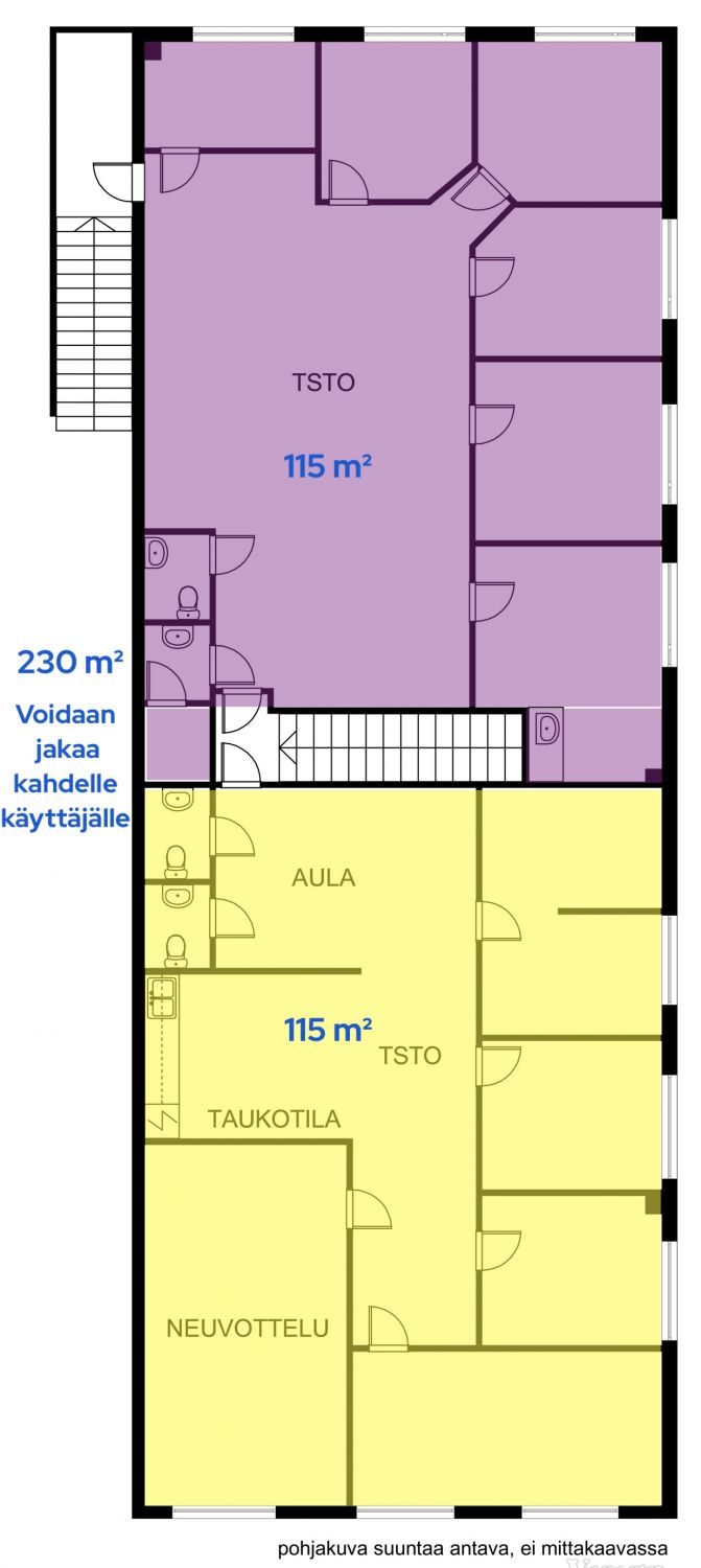 Mahdollisuus jakaa kahteen noin 115 m² osioon, omat WC-tilat ja keittiöt.