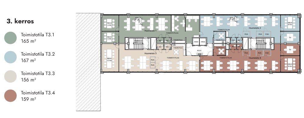 650m2 kokoinen kerros on mahdollista lohkoa neljälle käyttäjälle, jolloin tarjolla on n. 160m2 tiloja.