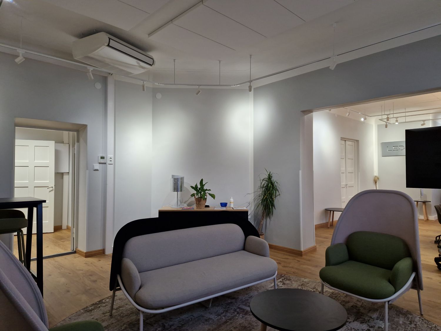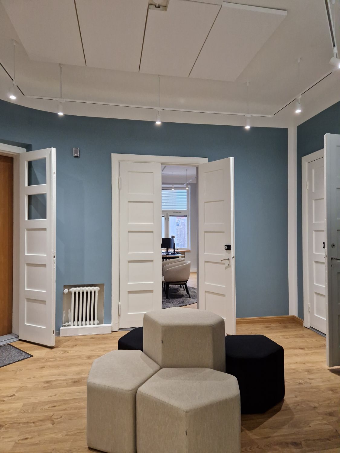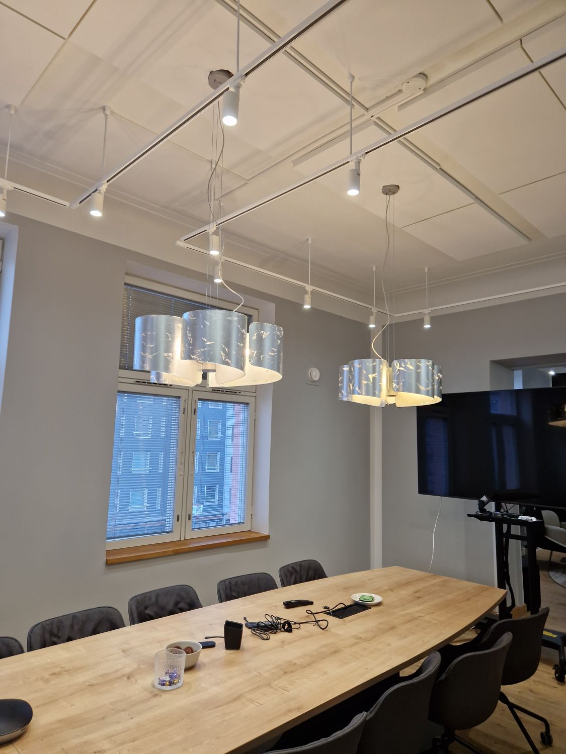 Huoneiden katossa on valokiskot, spottilamput ja akustiikkalevyt.