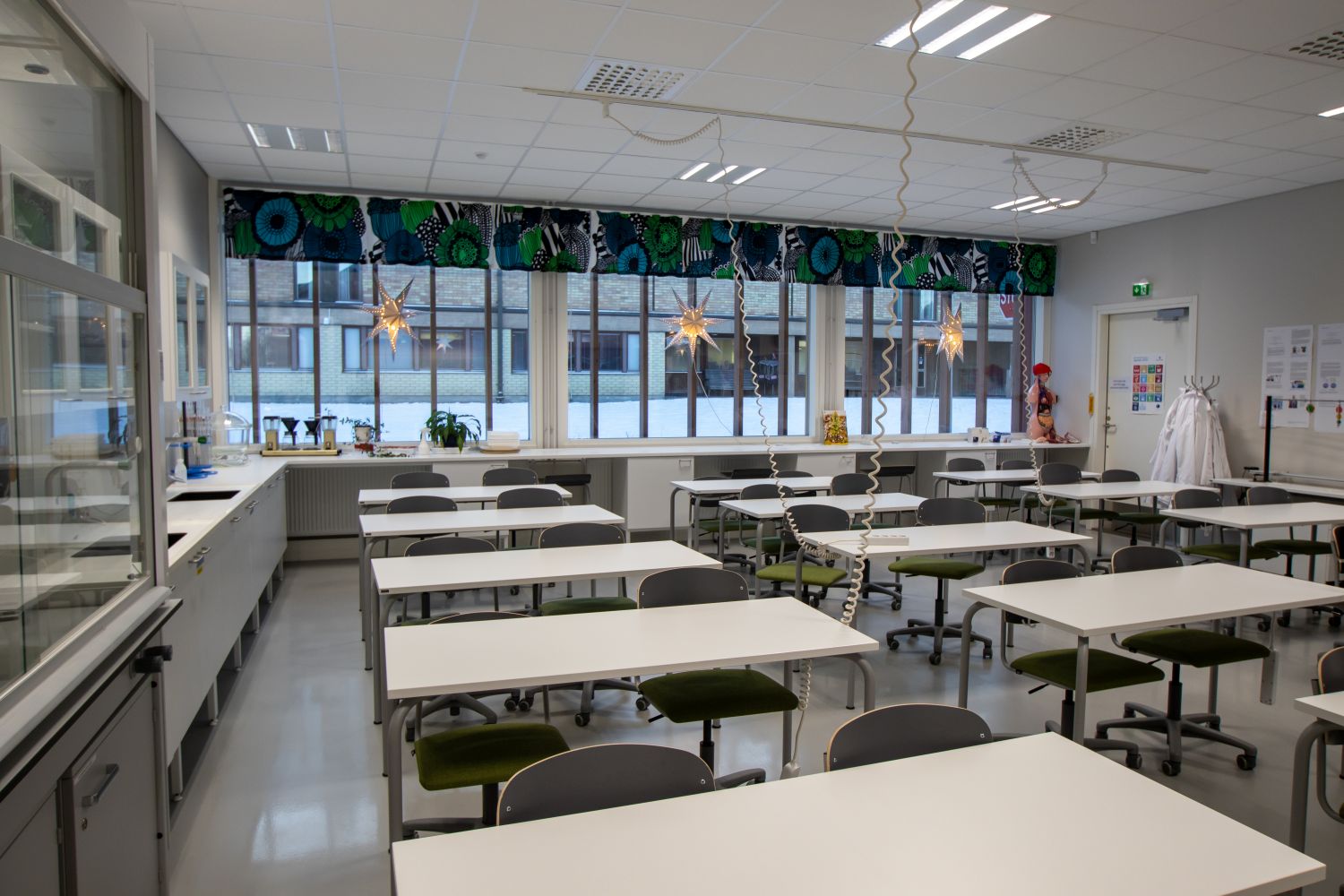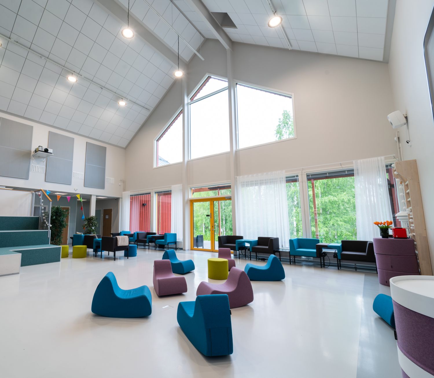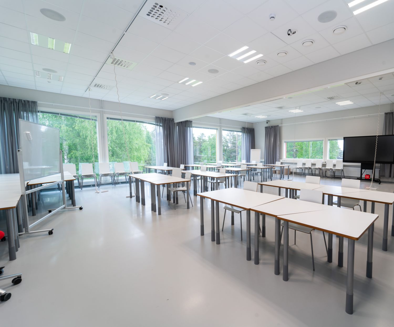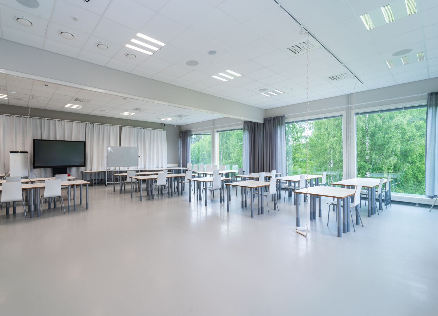 Tiloissa käyttötarkoituksen mukainen tehokas ilmanvaihto hiilidioksiditunnistimilla varustettuna, LED-valaistus läsnäolotunnistimin ja äänieristetyt luokka- ja kokoustilat.