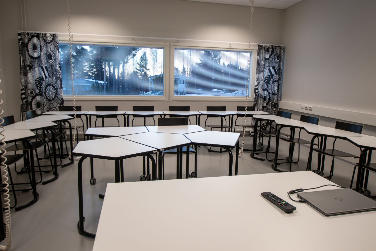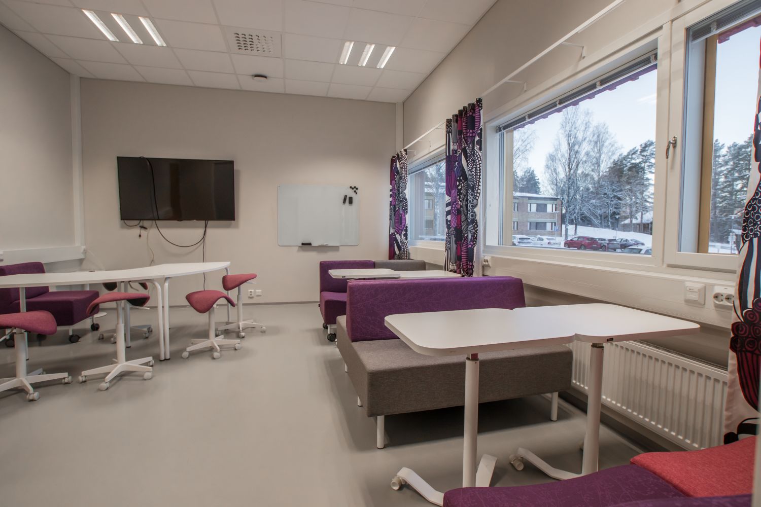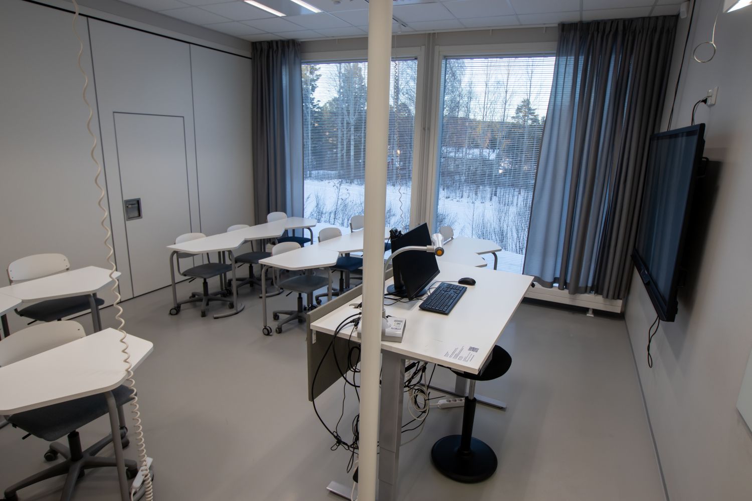 Tiloissa käyttötarkoituksen mukainen tehokas ilmanvaihto hiilidioksiditunnistimilla varustettuna, LED-valaistus läsnäolotunnistimin ja äänieristetyt luokka- ja kokoustilat.