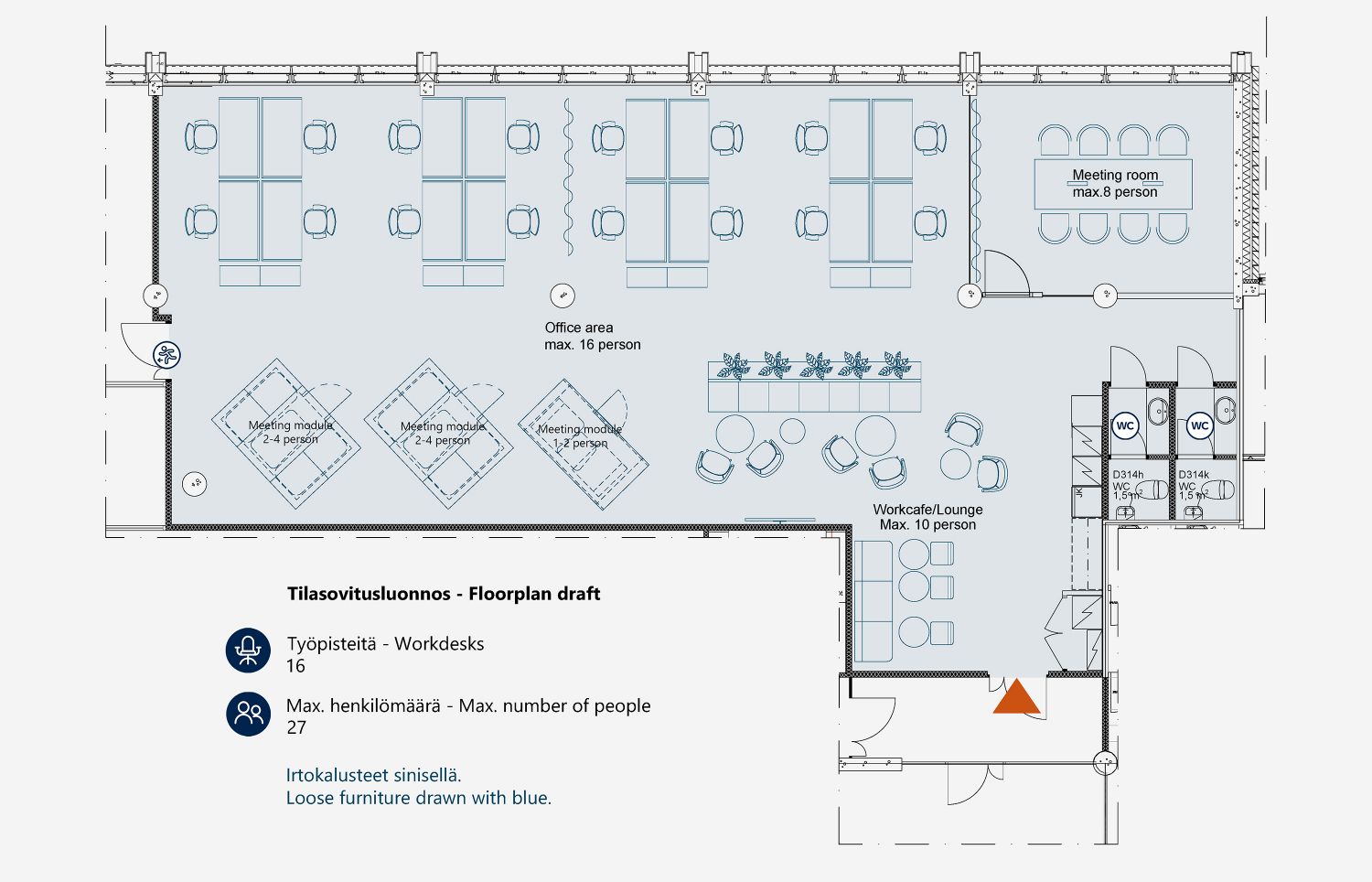 Tämä hiljattain kokonaan remontoitu, neliöiltään tehokas toimistotila sijaitsee Troolin D-rapussa. Tämän toimiston valoisaan avotilaan mahtuu työskentelemään 10-27 henkeä, lisäksi tilassa on neuvotteluhuone 8 hengelle. Keittiö + loungetila sijaitsevat sisäänkäynnin yhteydessä.