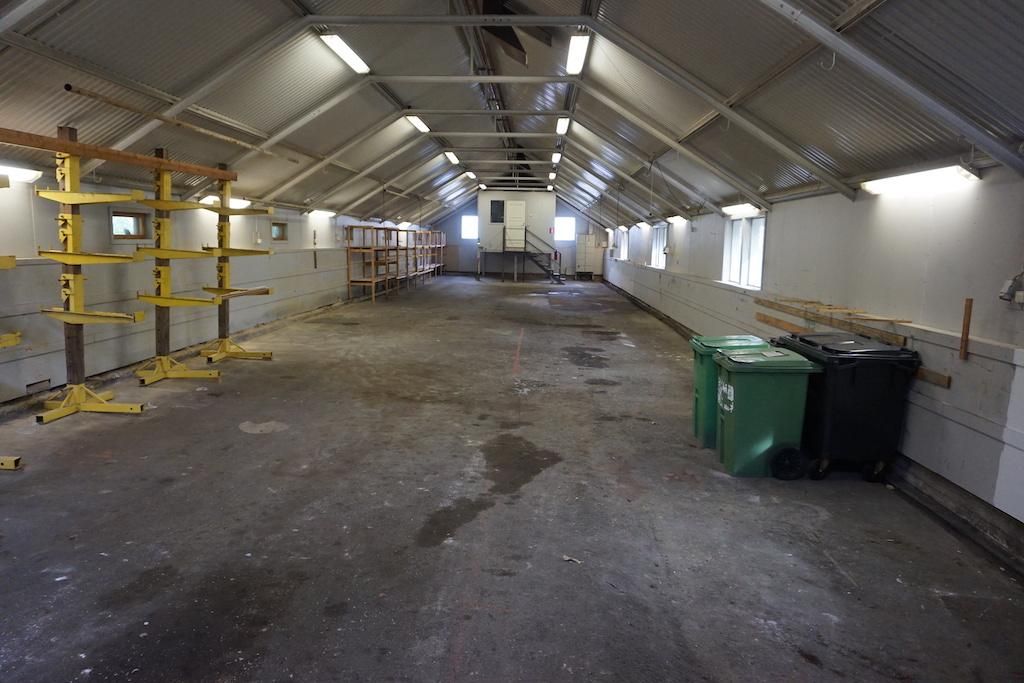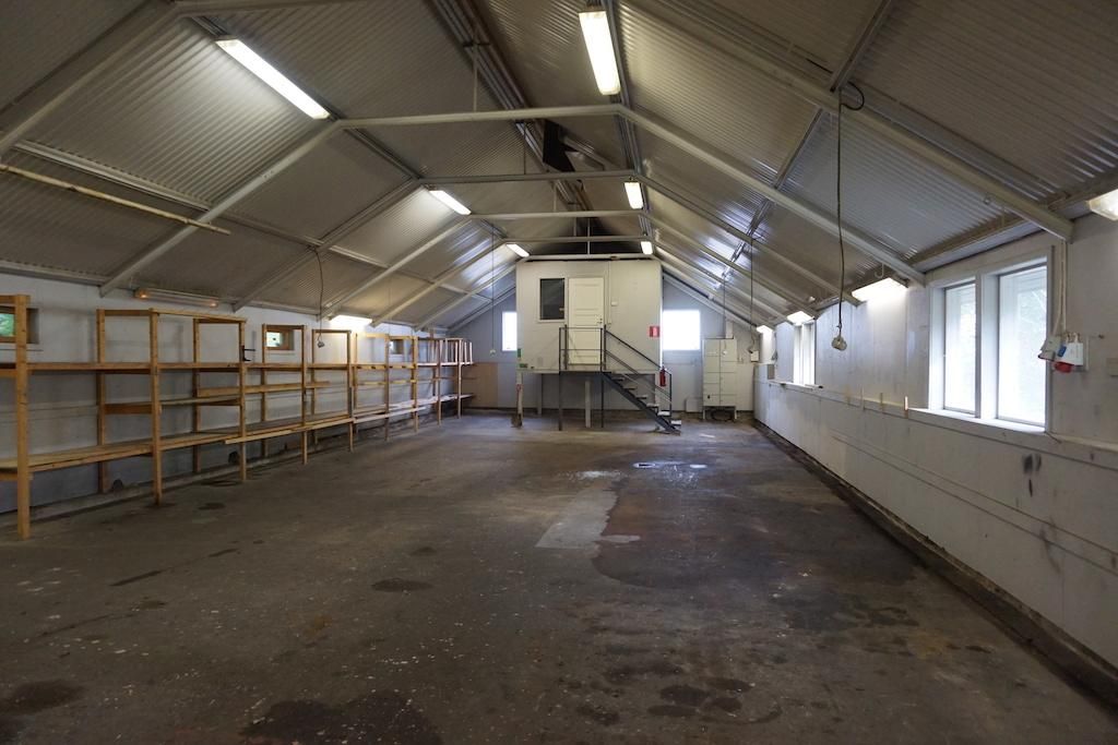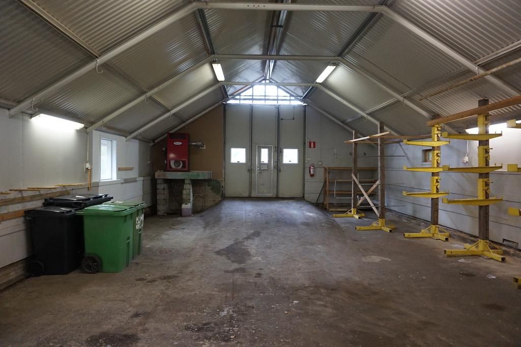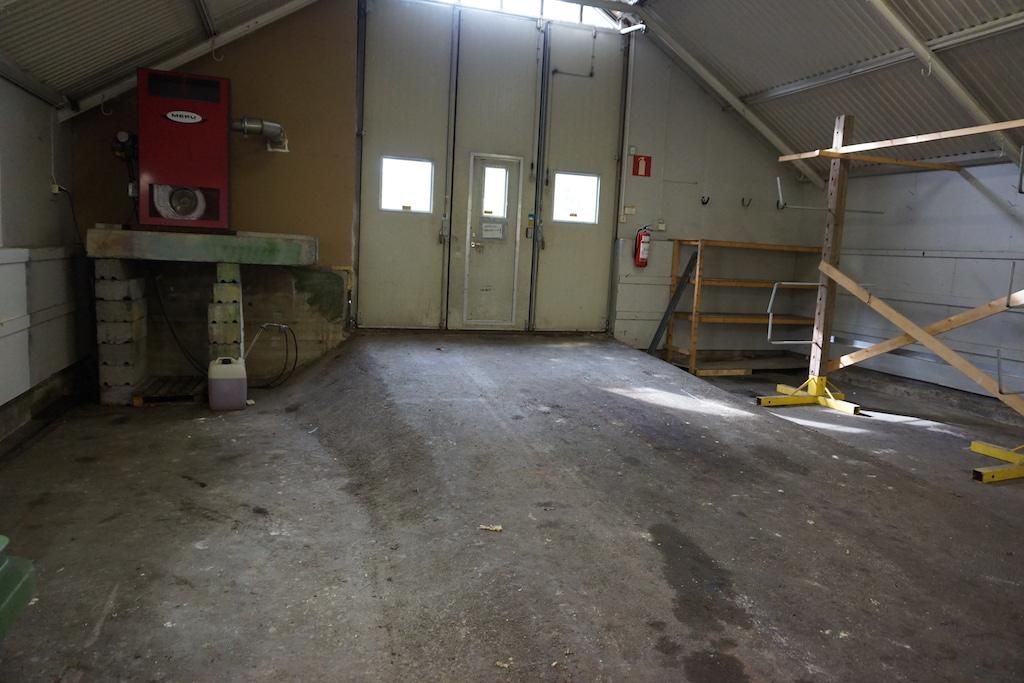 Tilan päädyssä on pieni taukotila. Halliin ei tule vettä. Lattiakaivo valumavesille.