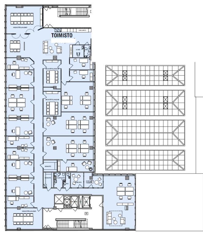 Tämä 718 m² toimisto sijaitsee kiinteistön 7. kerroksessa. Toimisto on huoneellinen, ja siihen kuuluvat omat keittiö- ja wc-tilat.