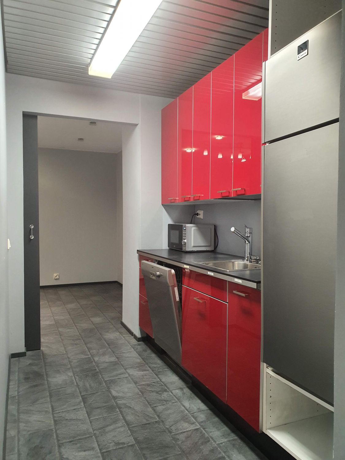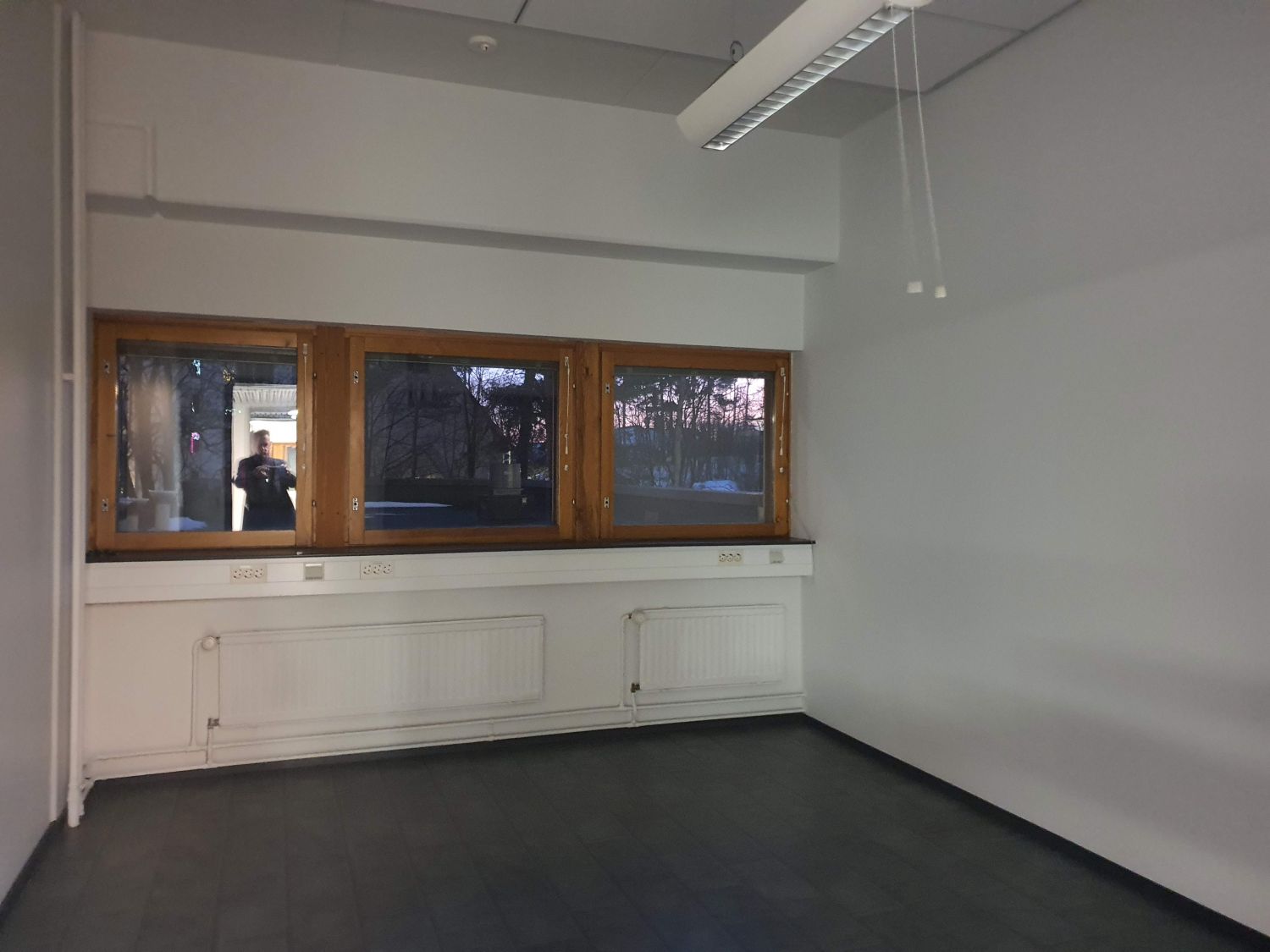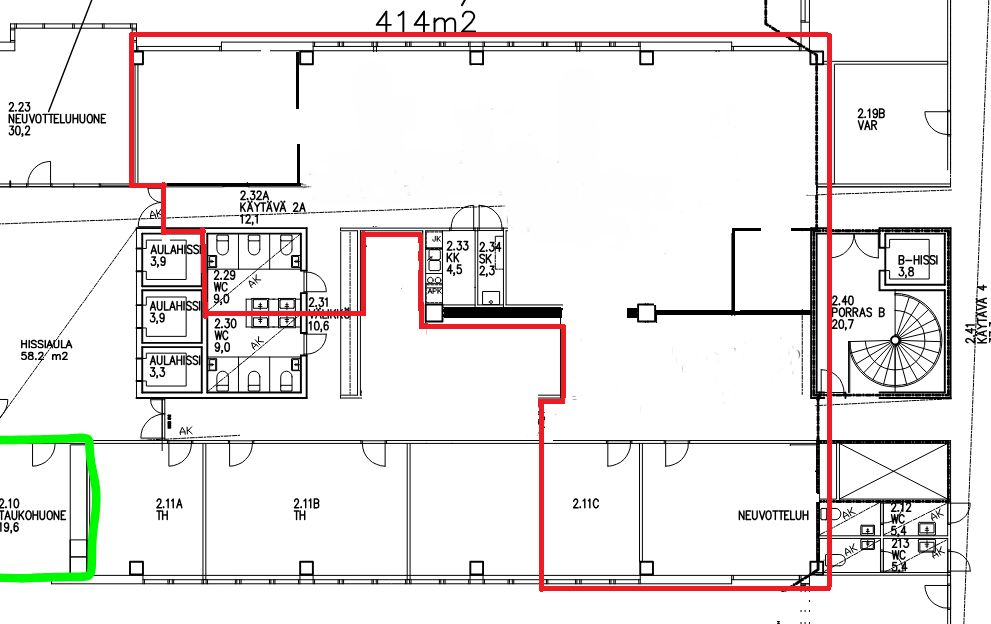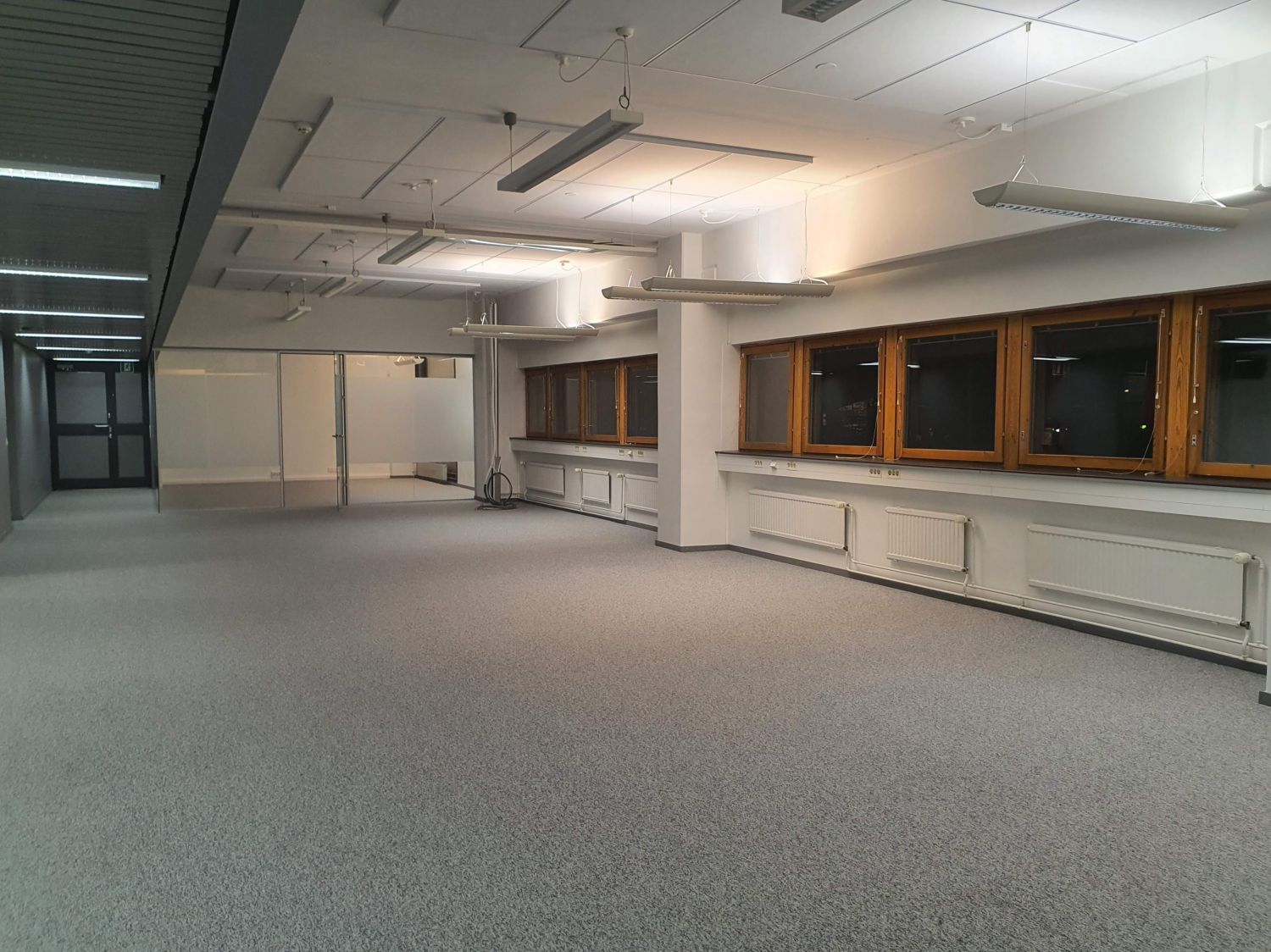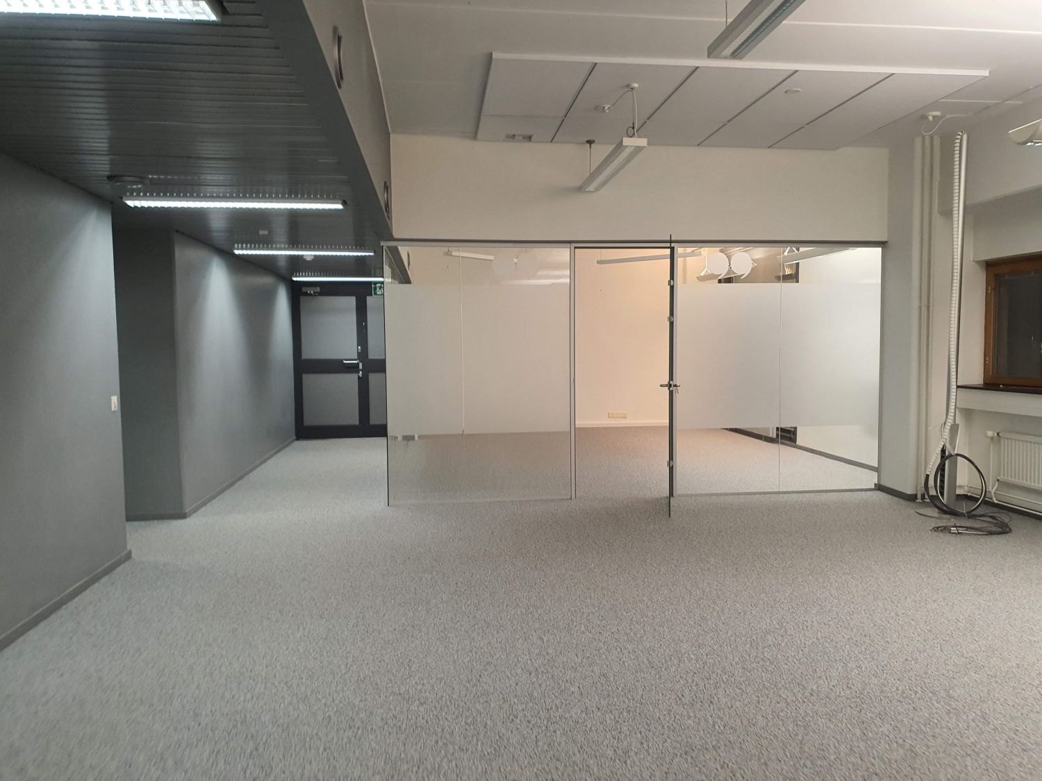 Avaraa toimistotilaa Huolintatalon 2. kerroksesta. Iso selkeä avotila jossa pari lasiseinäista neuvottelutilaa sekä erillinen pienempi avotilan ja toimistohuoneen yhdistelmä. Raikkaan punainen keittiö ja kolmen wc-kopin yhdistelmä.